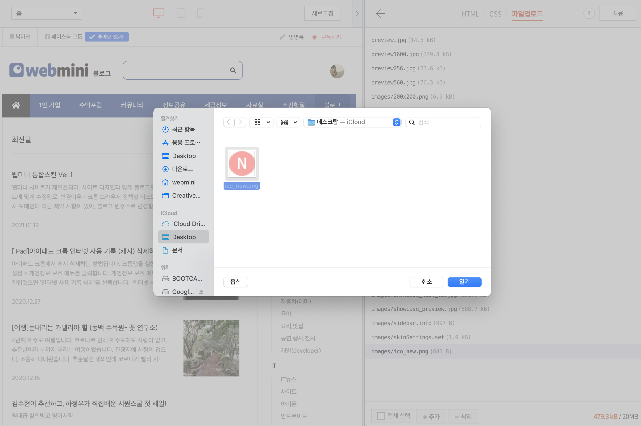 파일업로드에서 변경할 이미지를 추가해줍니다. (하단에 추가 버튼)
