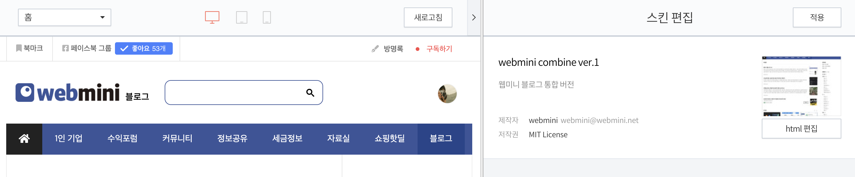 3. 스킨 편집에서 'HTML'을 클릭 후 아래 소스를 </head>바로 위에 삽입합니다.