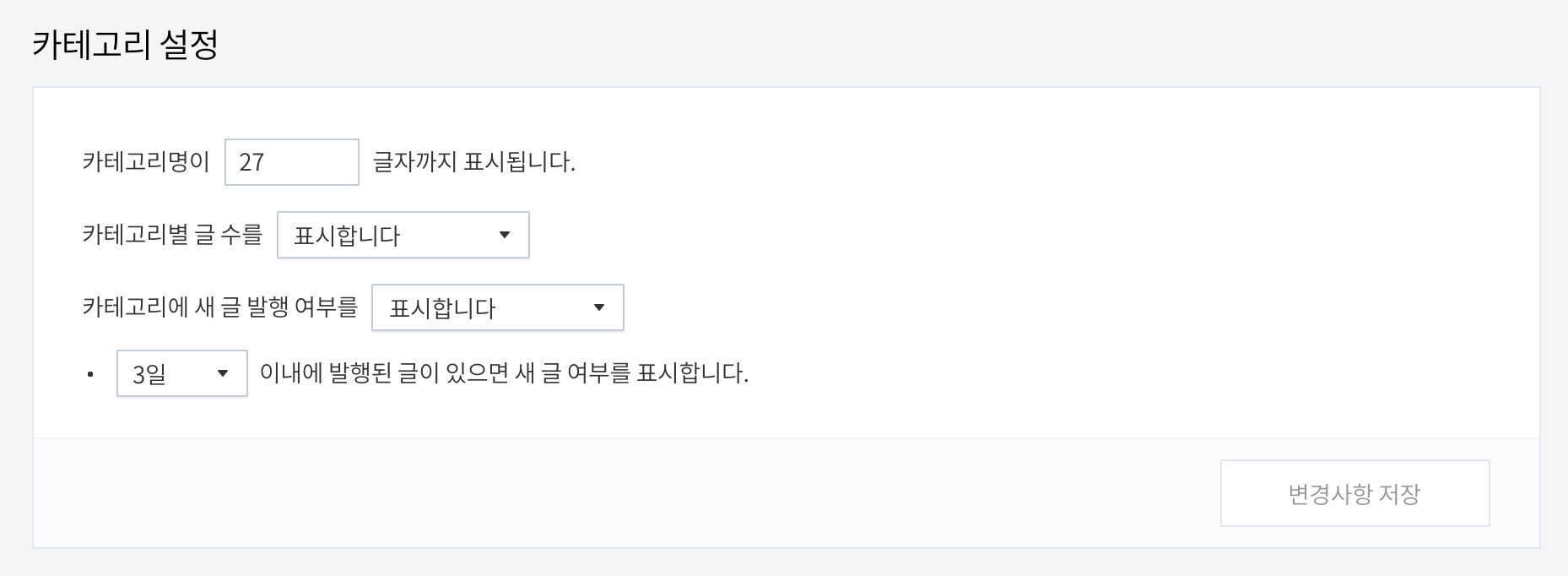 1. 관리자 > 콘텐츠 > 카테고리 관리에서 설정부분에 '카테고리에 새 글 발행 여부를 '표시합니다'로 먼저 변경해줍니다.