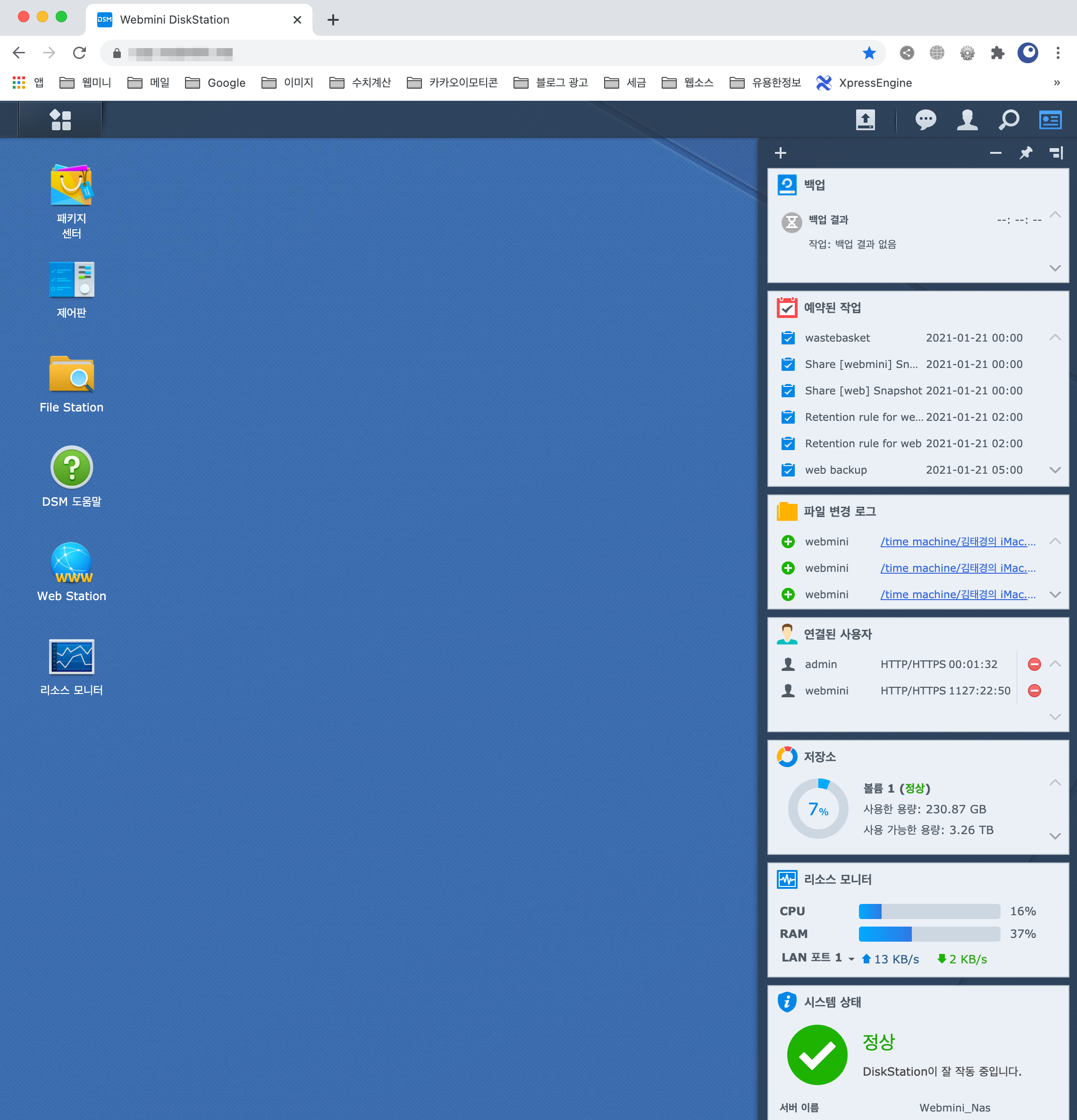 편리한 UI와 나스의 상태를 보여준다. (365일 열심히 일하고 있다.)