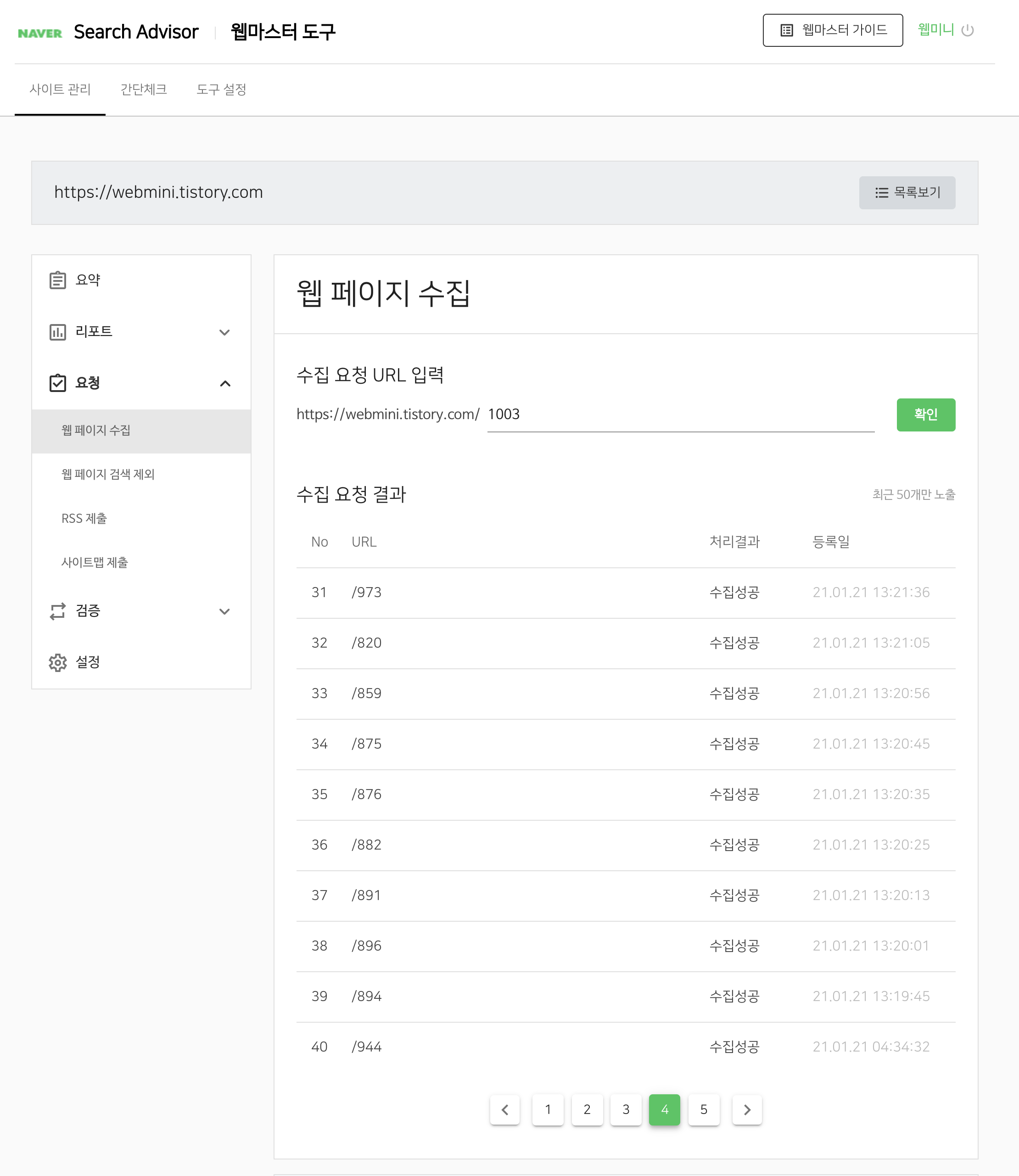 할수 없이 네이버 서치어드바이저에서 일일이 웹 페이지 수집요청을 하고 있는데, 수집은 되어도 뭔가 허무한 느낌이 드네요. 당연히 같은 키워드로 검색을 해도 상위노출 되던글이 뒤로 밀려서 노출이 되게 되었습니다.