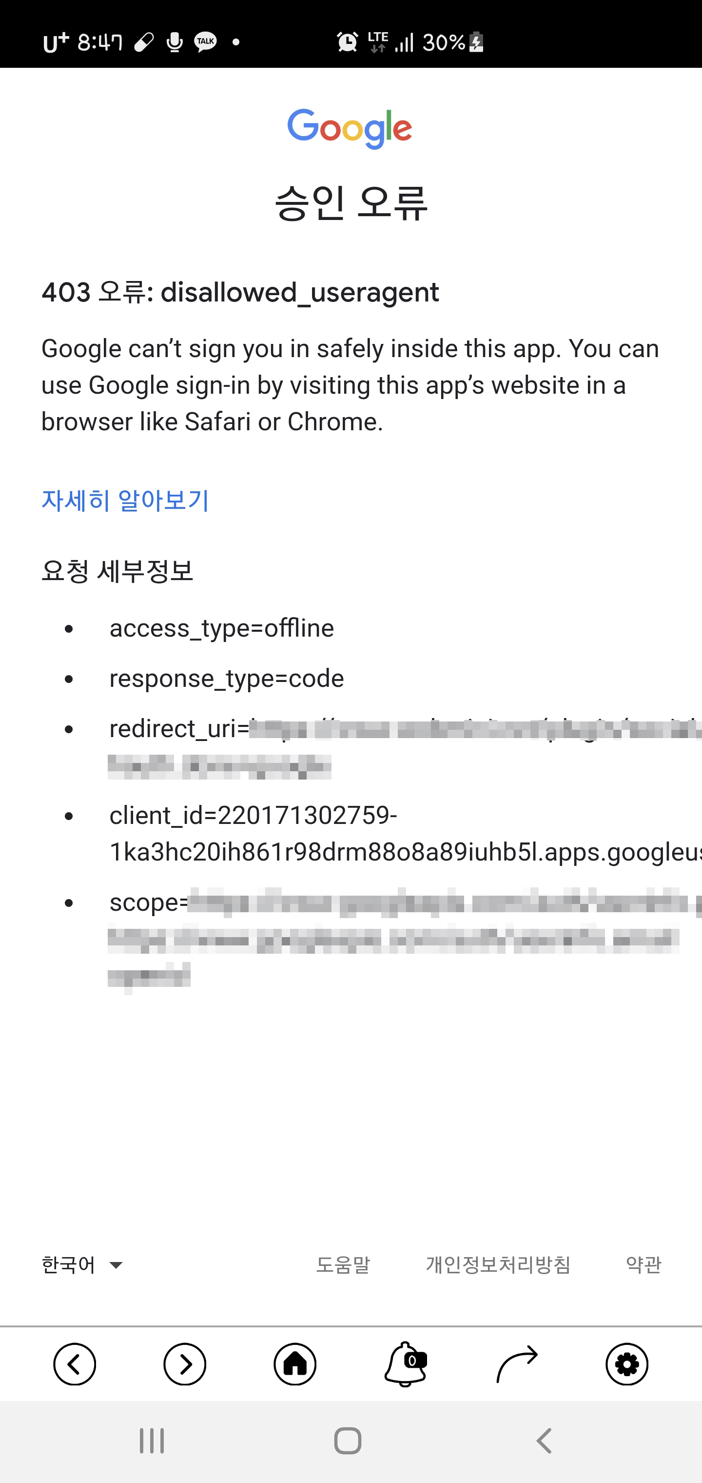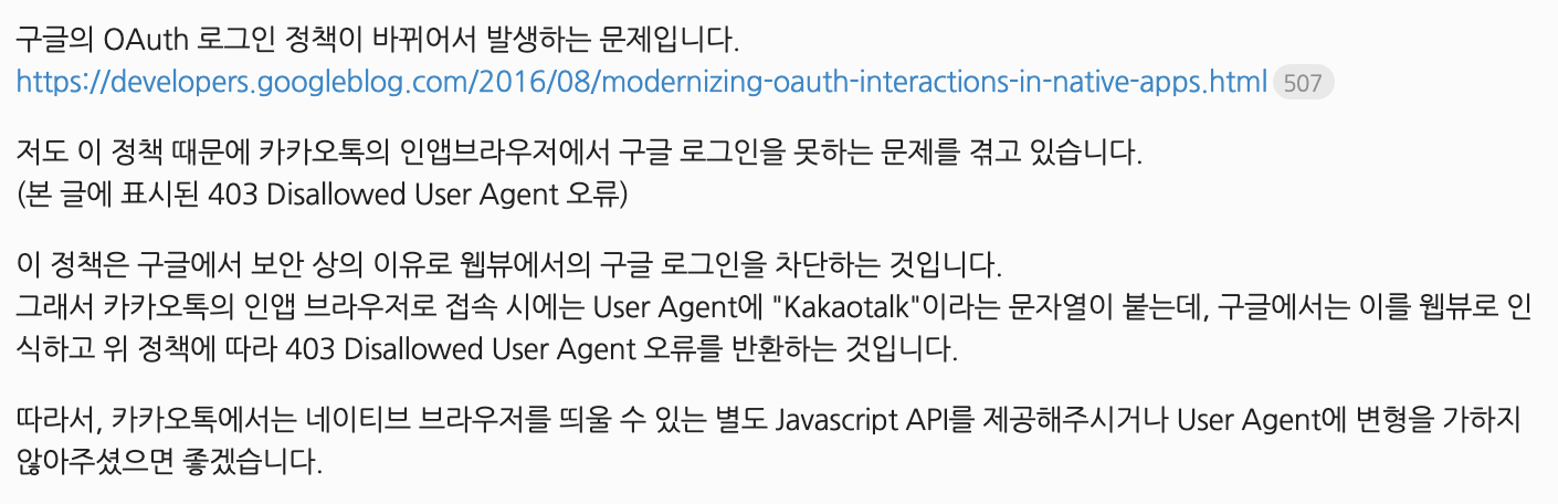 문제는 앱뷰에서 구글로그인시 403 승인 오류가 발생합니다. (카톡에서도 마찬가지입니다.)
