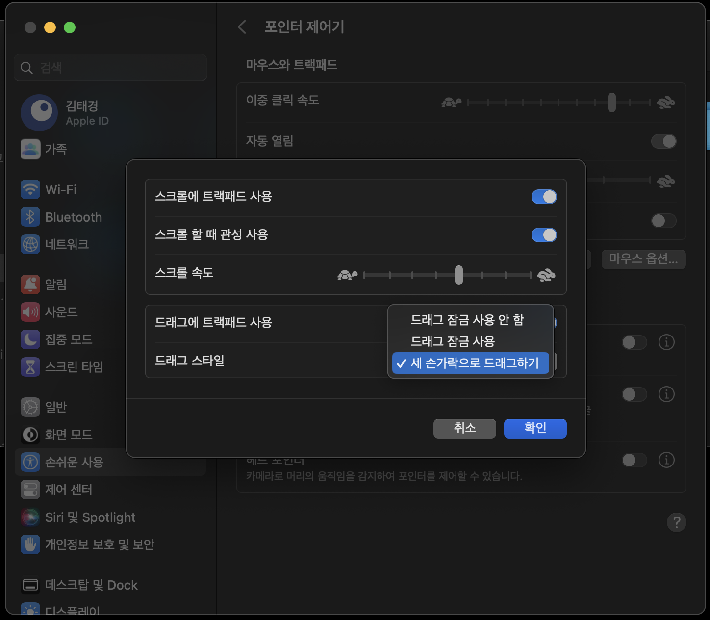트랙패드 옵션에서 드래그 스타일을 세 손가락으로 드래그하기를 선택합니다.