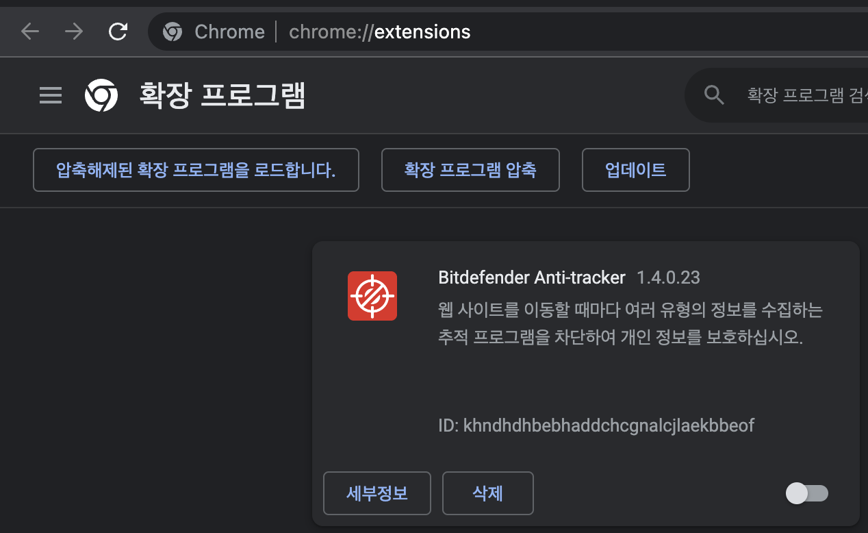여러 광고 차단해주는 확장 프로그램이 있지만 저같은 경우는 Bitdefender Anti-tracker 을 사용하기에 해당 프로그램을 비활성화 해주었습니다.