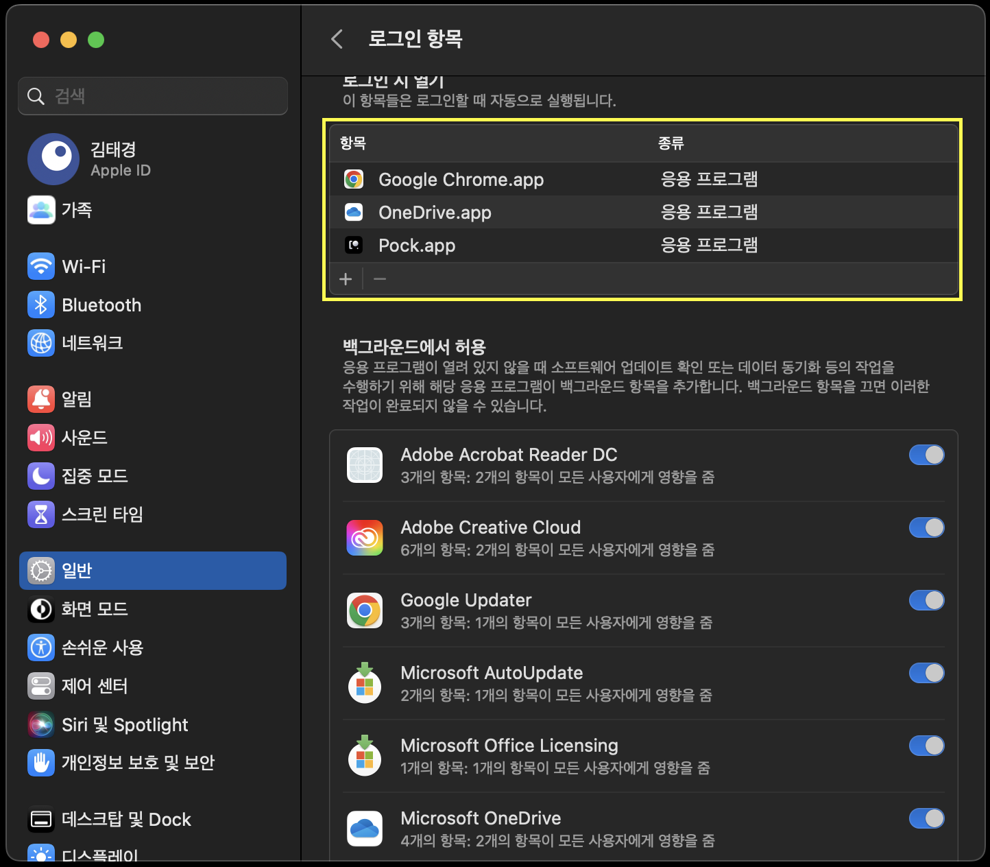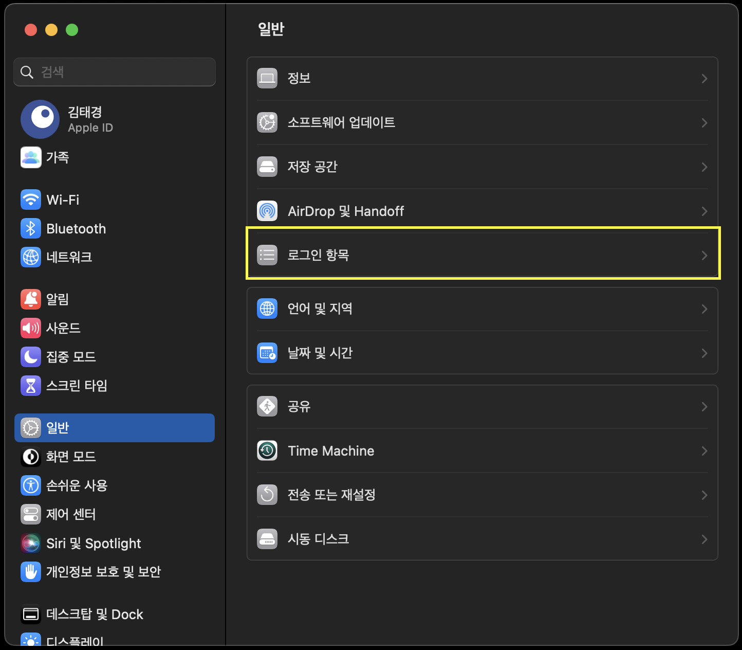 시스템 설정 > 일반 > 로그인 항목에 접근합니다.
