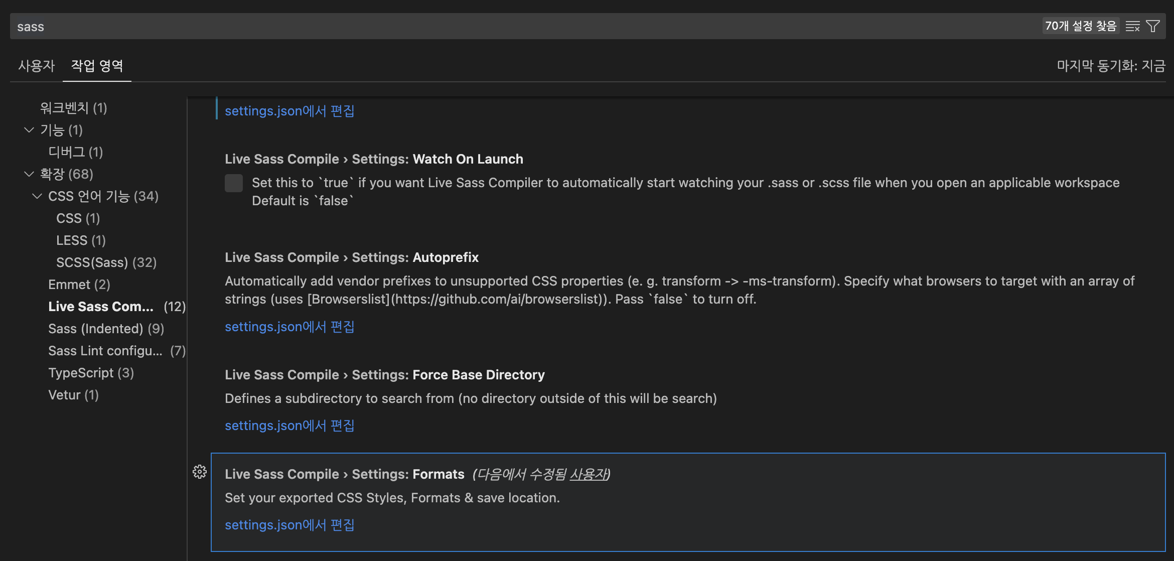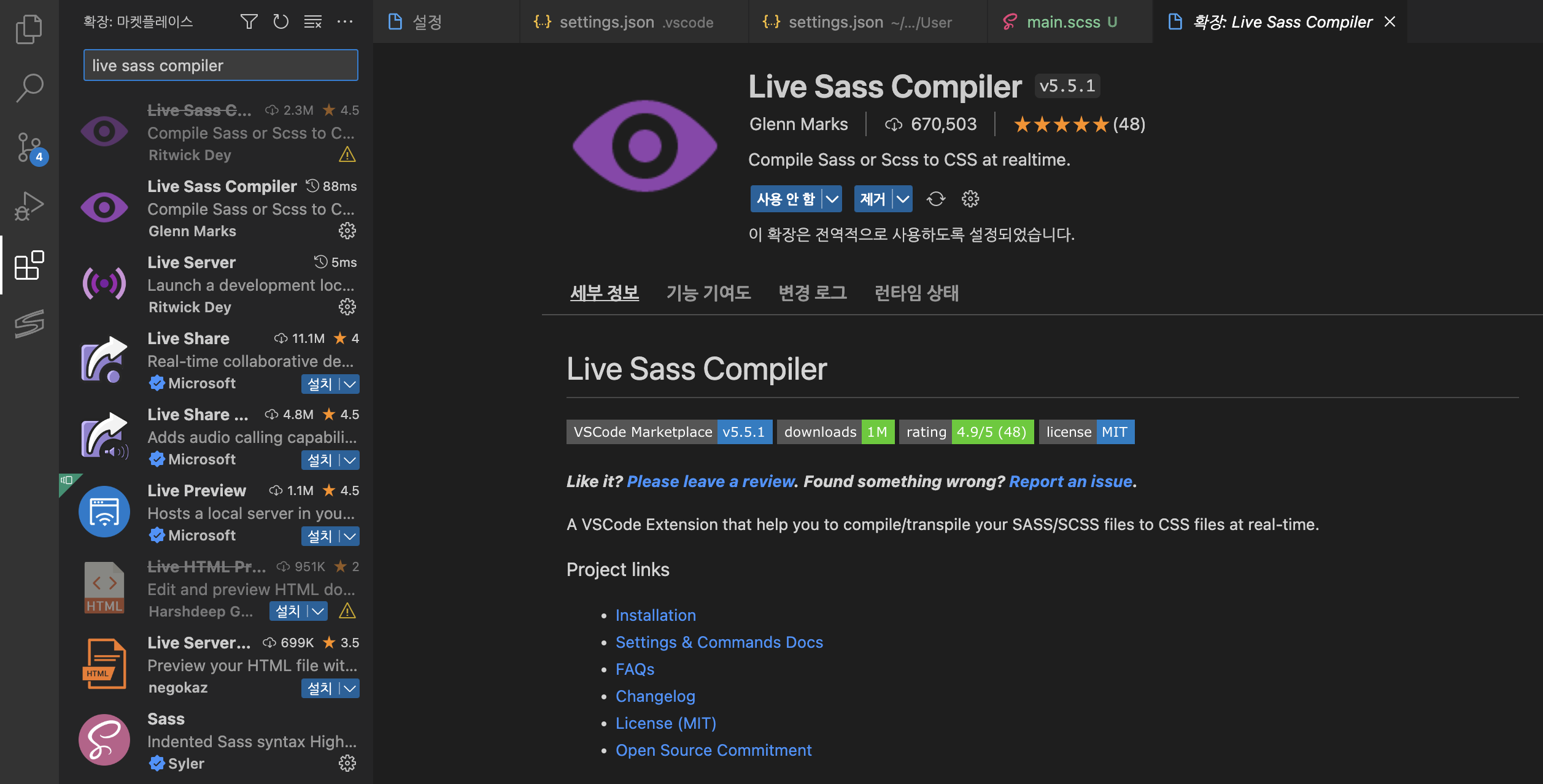 검색창에 sass를 입력후 Live Sass Compile를 클릭하면 우측에 셋팅파일을 작성할수 있습니다.