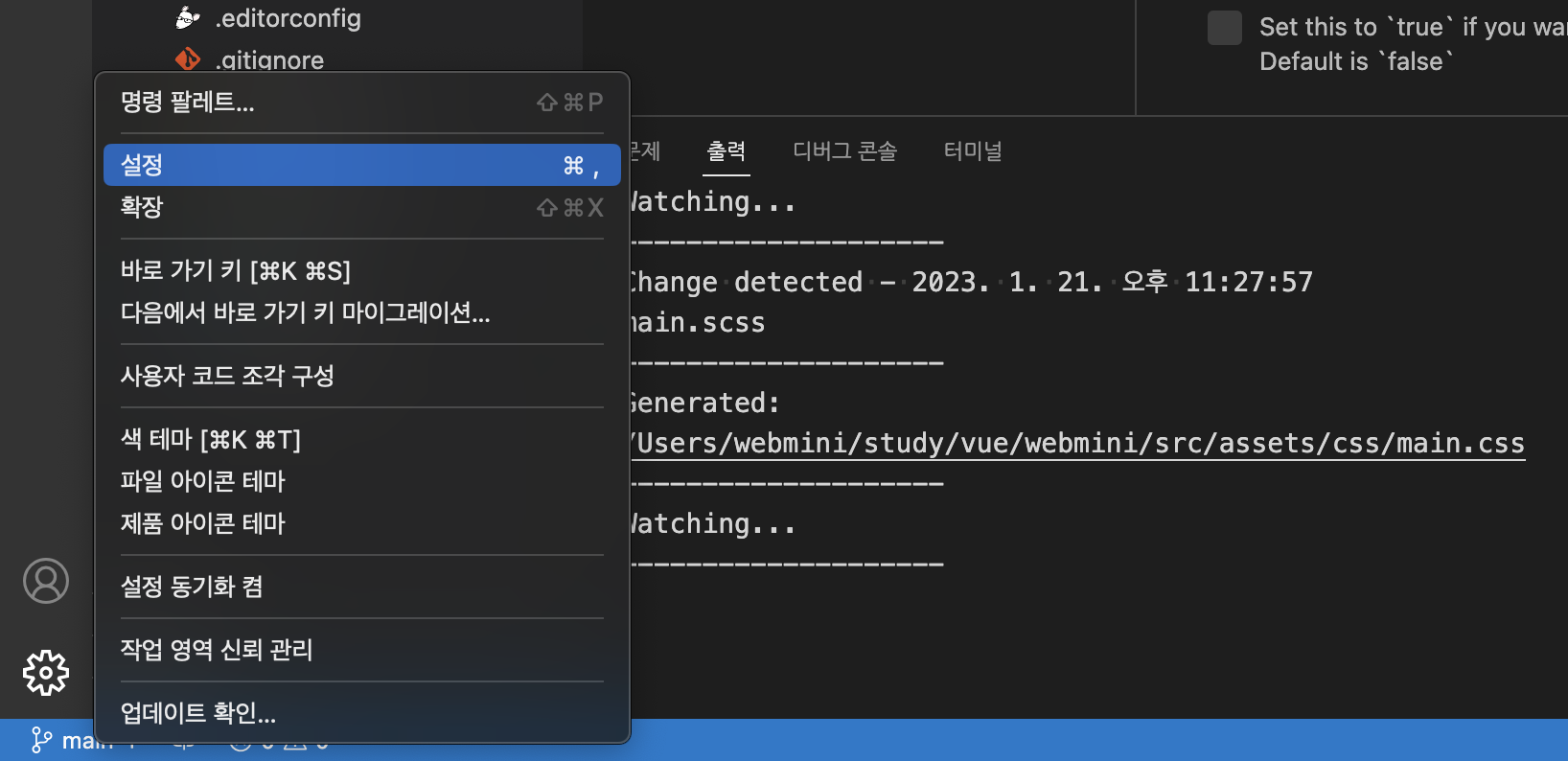 vscode에서 설정파일을 엽니다. (mac 단축키 : command+,)