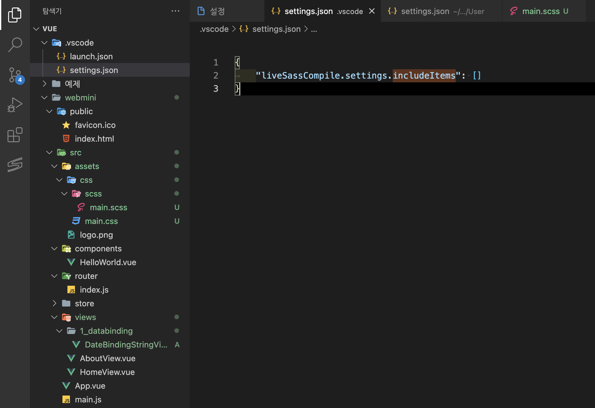 node.js와 sass를 이상없이 설치했는데, vscode에서 Live Sass Compiler로 컴파일이 안됐을때는 settings.json 파일을 확인해보셔야합니다.