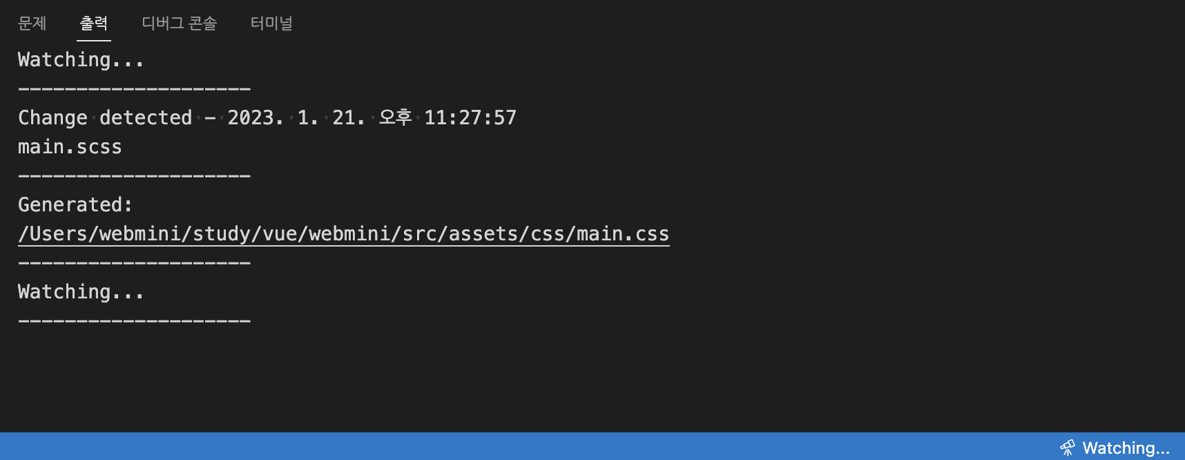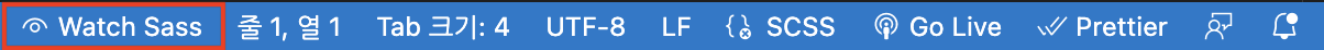 실행 방법은 vscode 하단에 Watch Sass로 되어있는걸, 클릭하면 Watching...로 변경됩니다.
