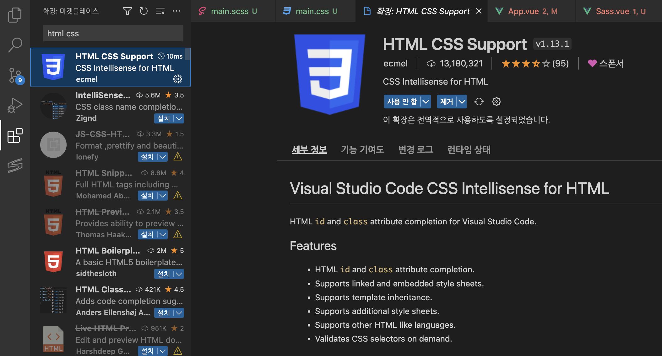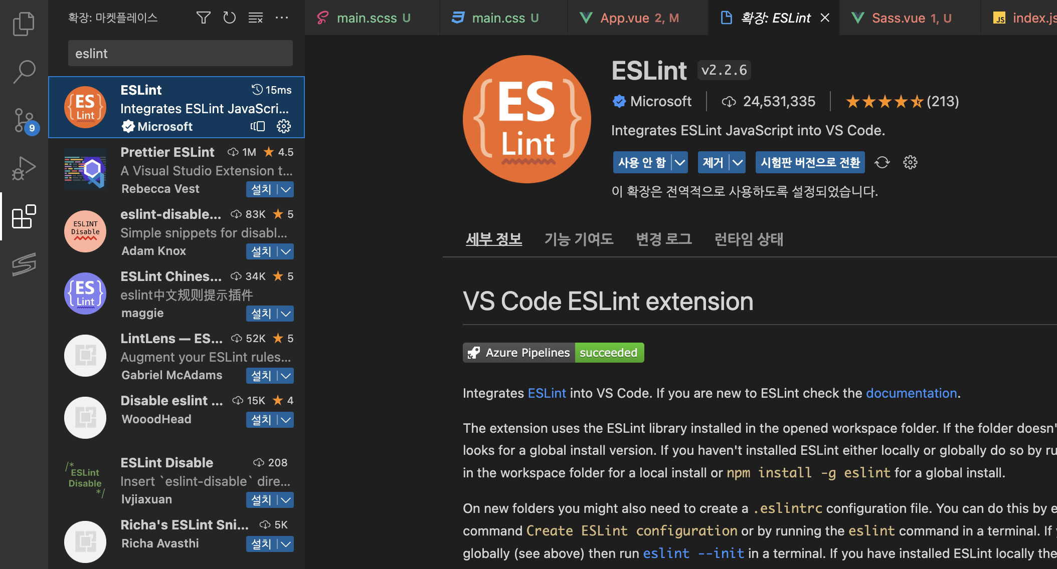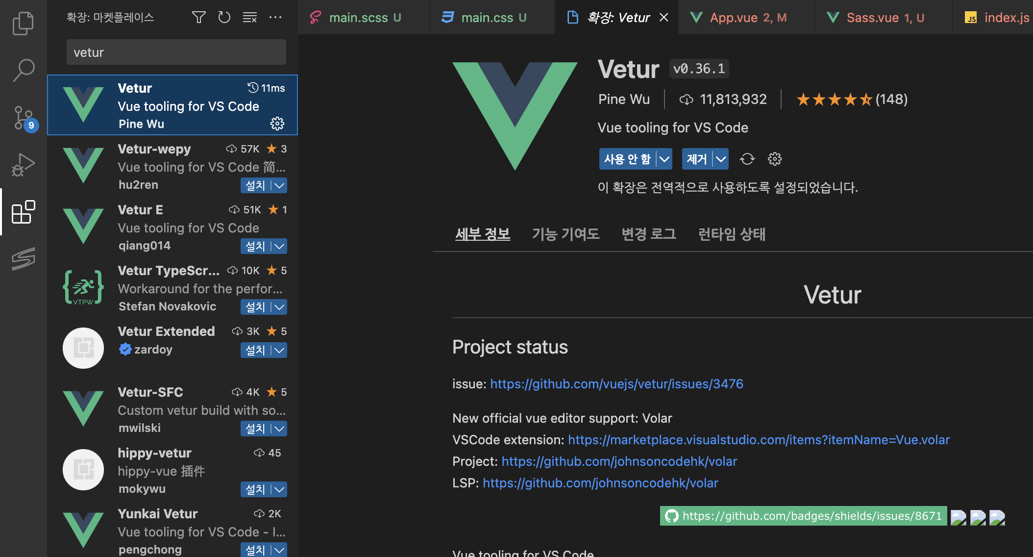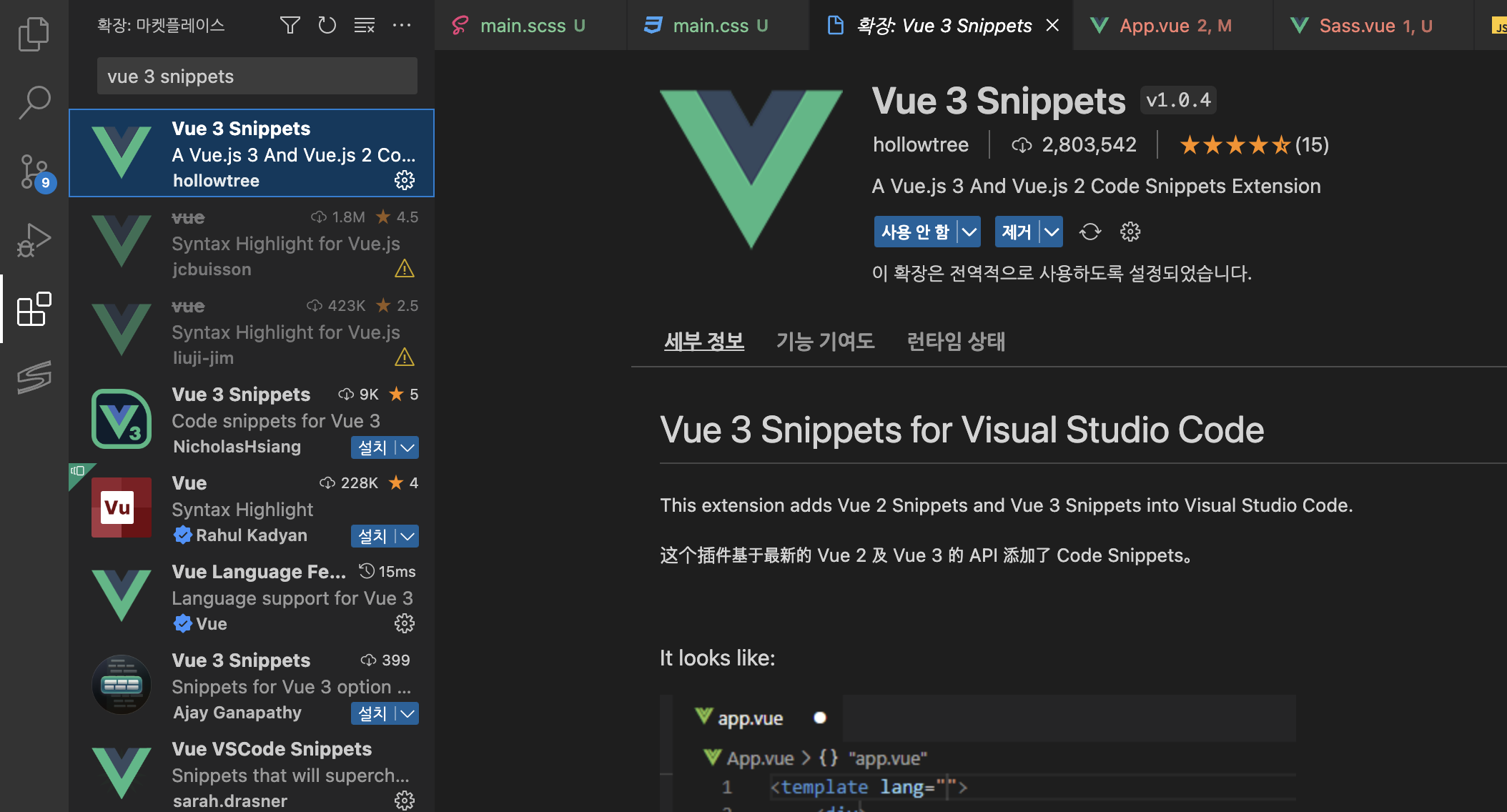 참고로 vetur은 vue2때 사용했으며, vue3을 사용할경우 호환성 문제로 오류가 발생할 수 있다고 합니다.