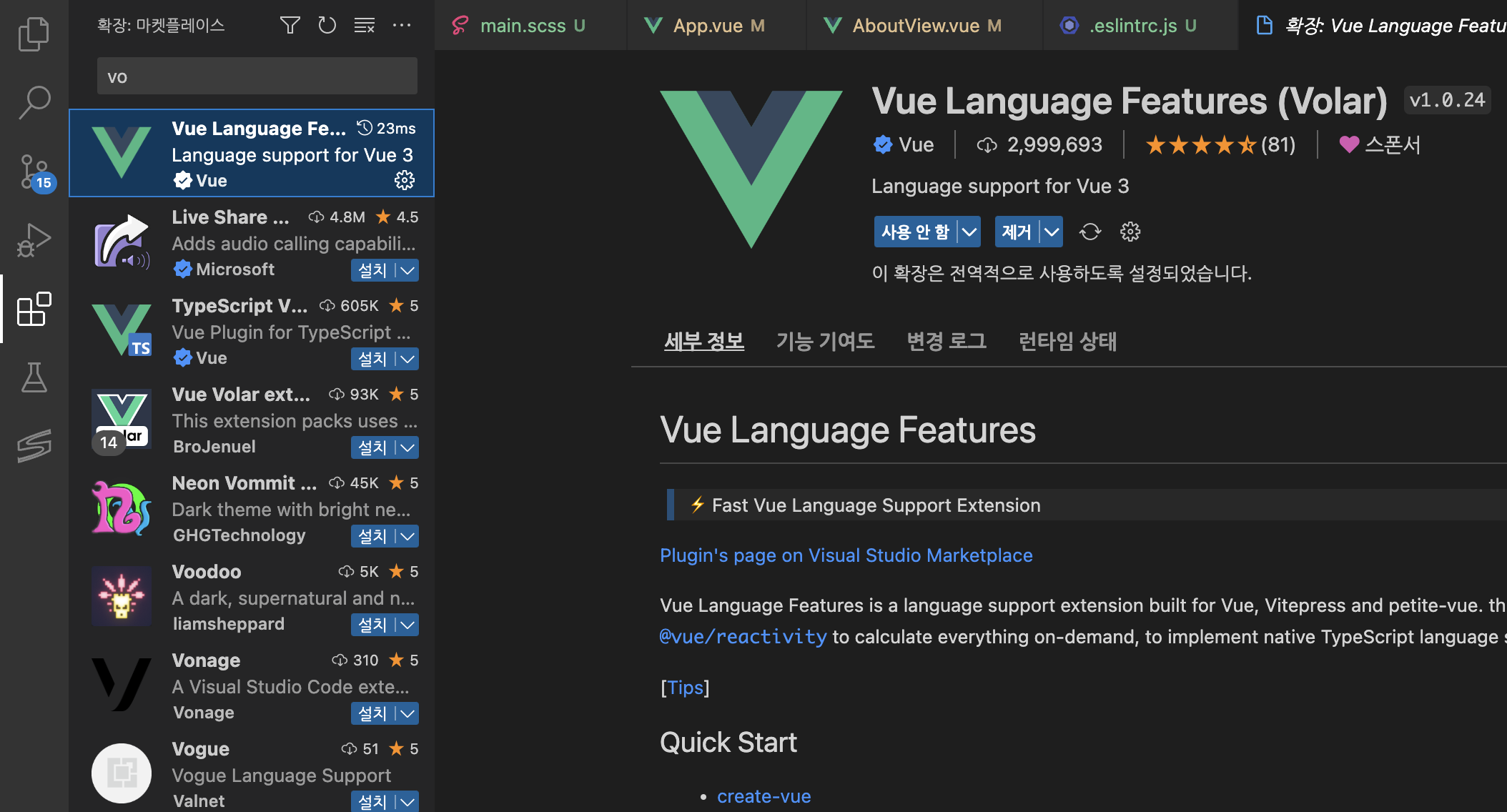 3. vetur확장팩 삭제 (VUE3 사용자)