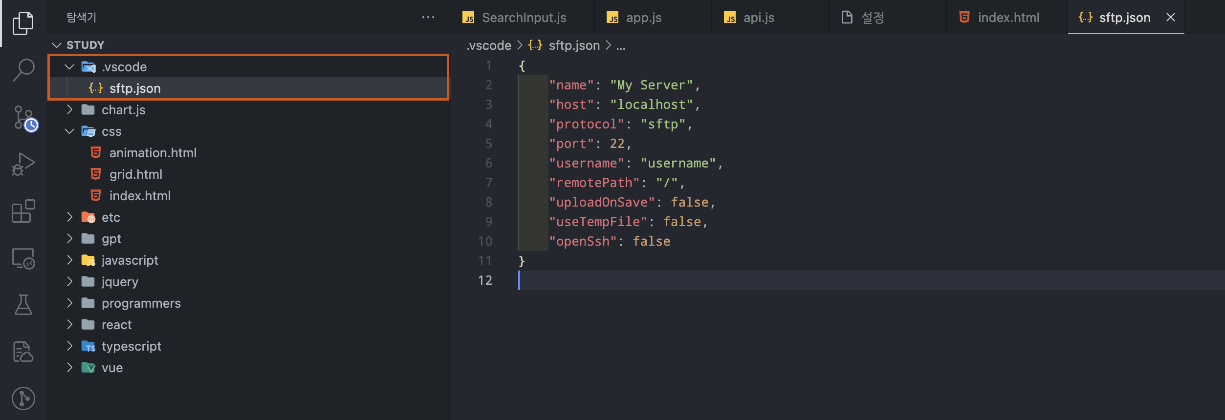 설정이 끝나면 해당 프로젝트 폴더에 .vscode > sftp.json 파일이 생성되있을겁니다.