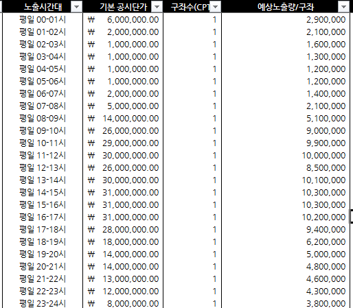 16시-17시 한 시간 광고가 노출되는데 31,000,000원이라는 돈이 들어갑니다.