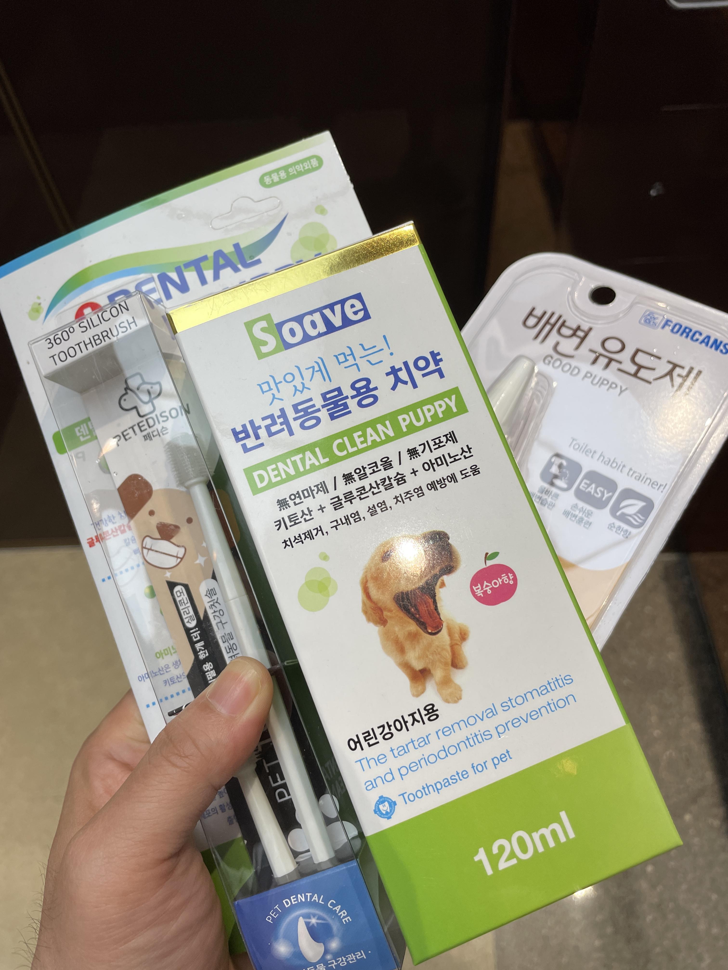 병원 옆에 보니 24시간 애견용품점이 있길래 나도 모르게 왠지 들려야 할 듯해서 치약하고 칫솔 배변 유도제를..