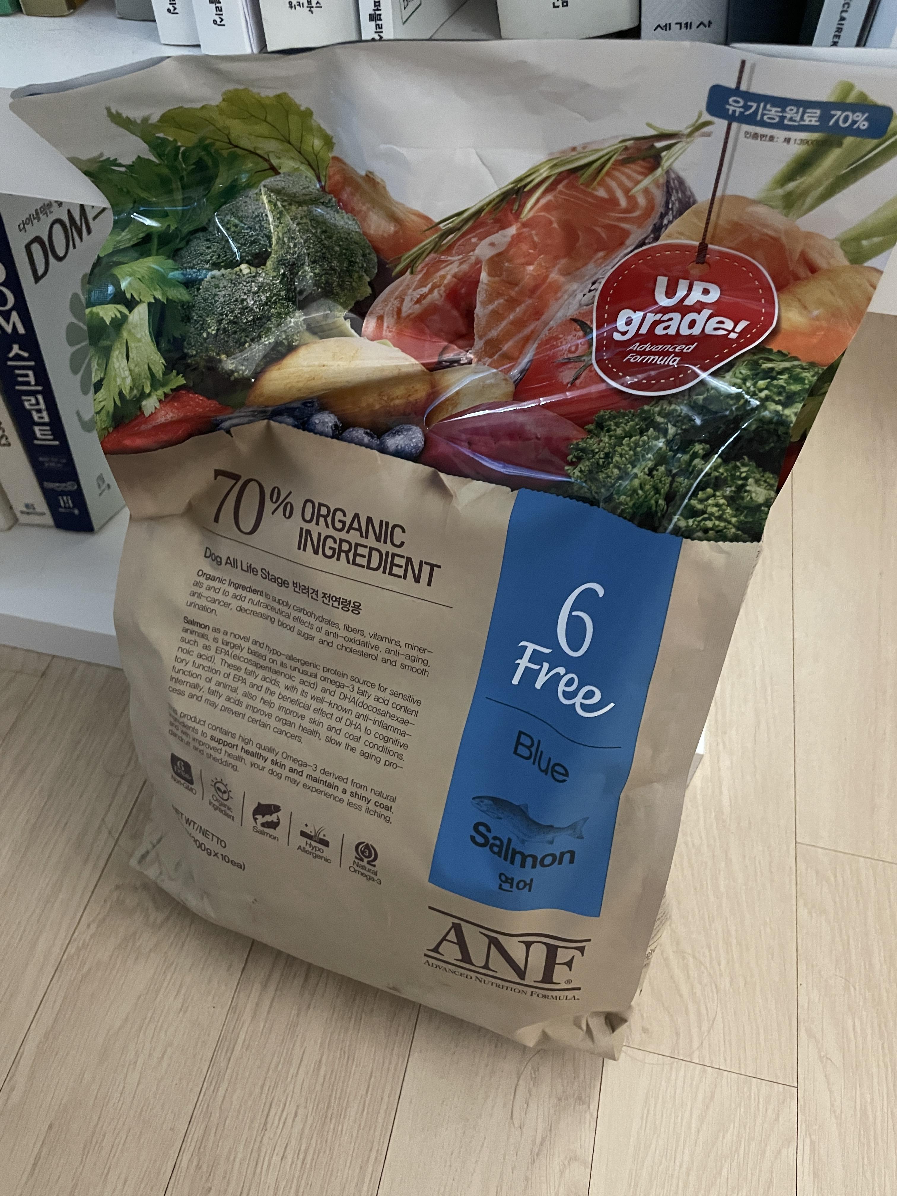 지인들 추천으로 유기농 사료로 바꾸긴 했는데, 기존 사료보다 잘먹긴 해서 확실히 사람이나 동물이나 "연어의 맛은 어쩔 수 없구나"라는 생각을 했다.