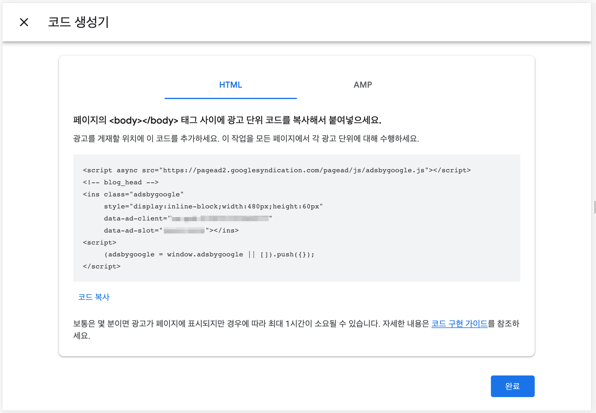해당코드를 복사 후 블로그나 사이트 원하는 위치(광고가 노출될 위치)에 넣으시면 됩니다.