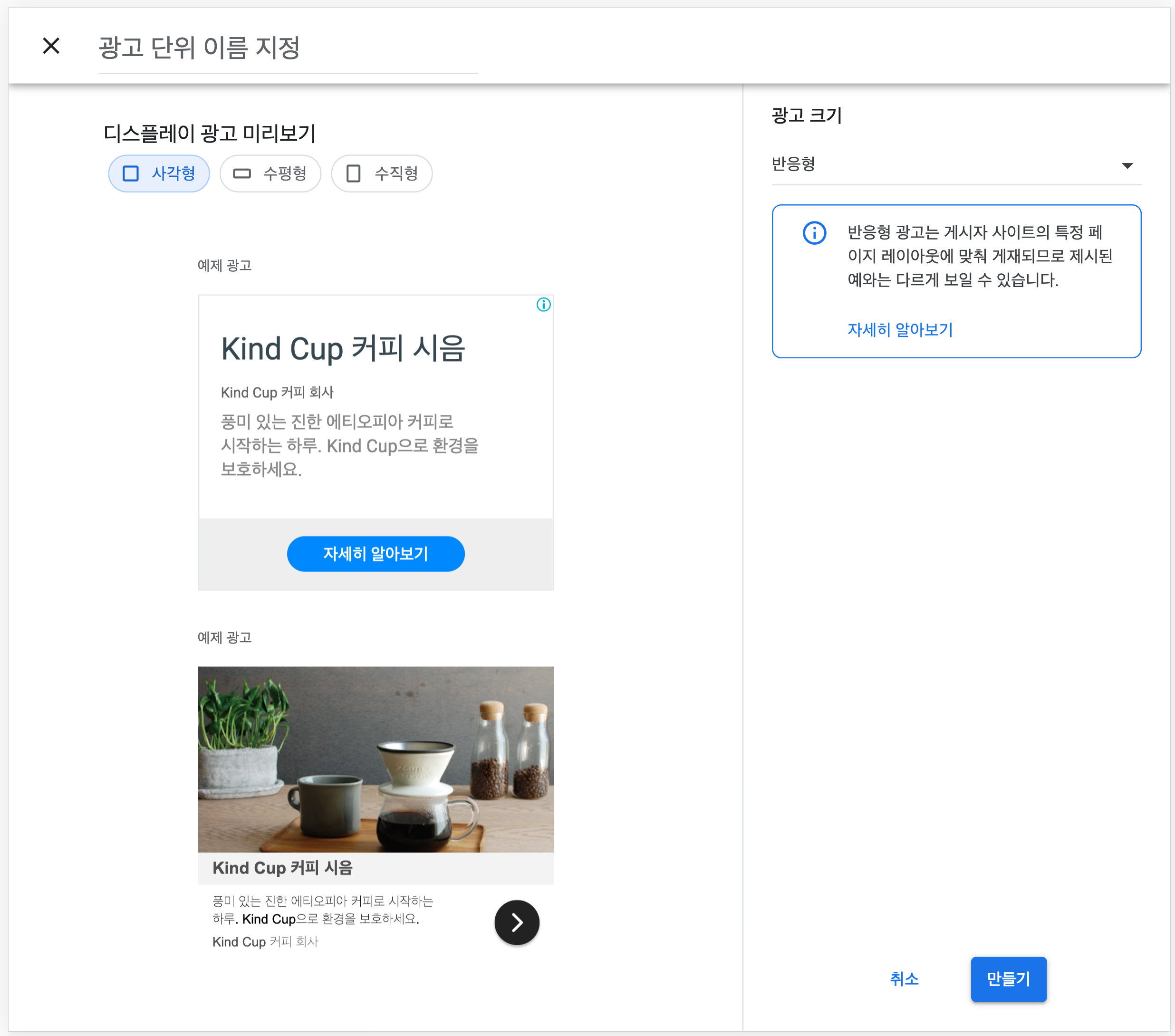 디스플레이 광고형태 = 사각형,수평형,수직형으로 제공이 되며, 말 그대로 사각형으로 보여줄 건지, 수평으로 넓게 보여줄 건지, 수직형태로 길게 보이는지에 대한 설정입니다.