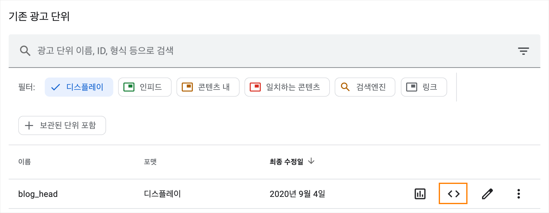 만들어진 광고는 아래와 같이 생성이 되며, 해당코드는 '<>' 표시를 누르시면 됩니다.
