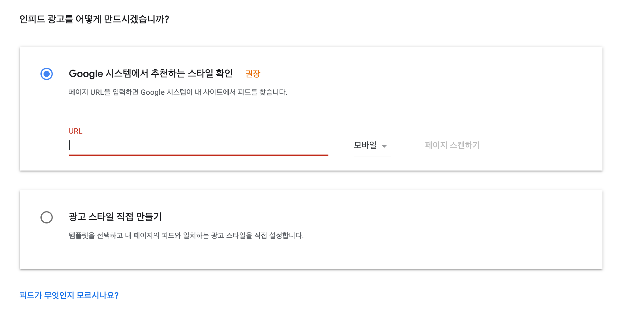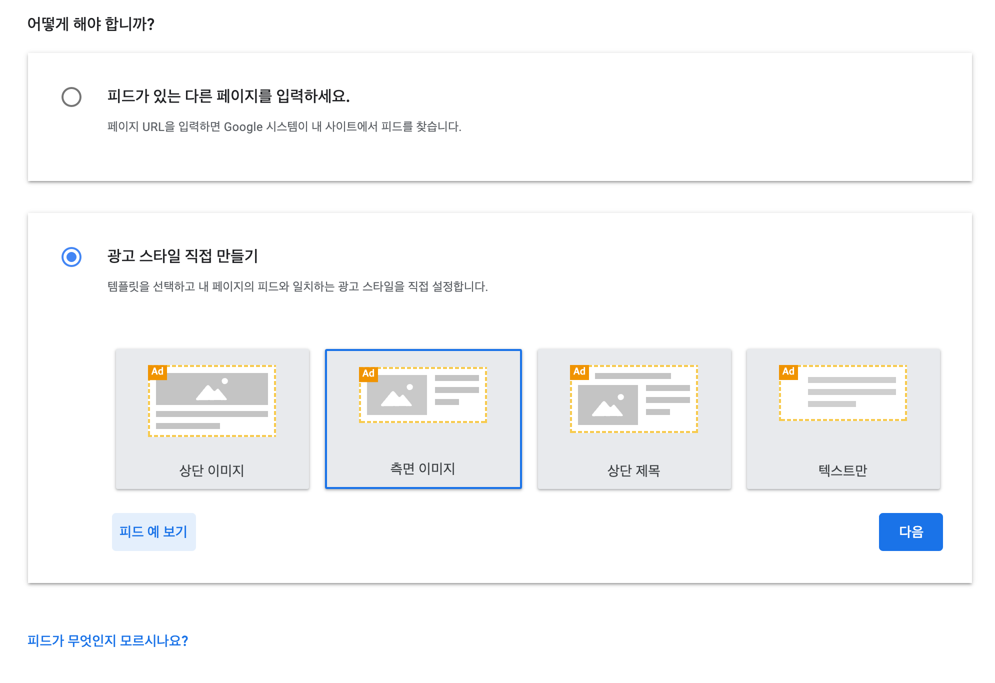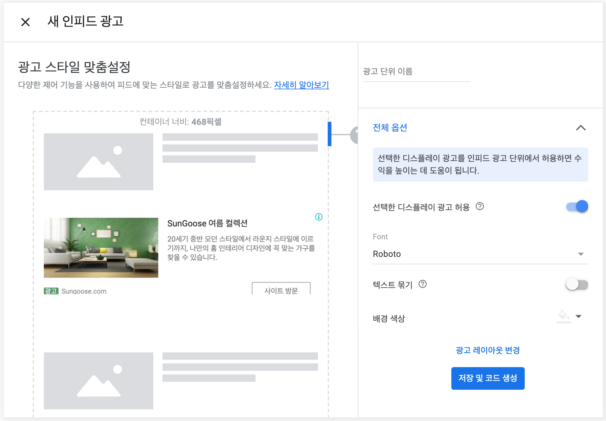 자동으로 사이트를 스캔해서 사이트 디자인과 비슷한 광고 스타일로 만드는 방법과 직접스타일을 만드는 방법이 있습니다.