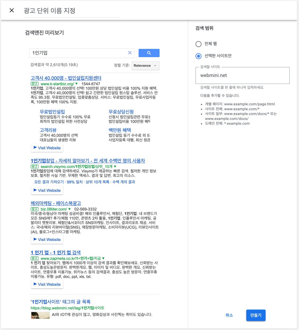 맞춤 검색을 통해 검색 결과에서 구글 광고를 노출이 됩니다.