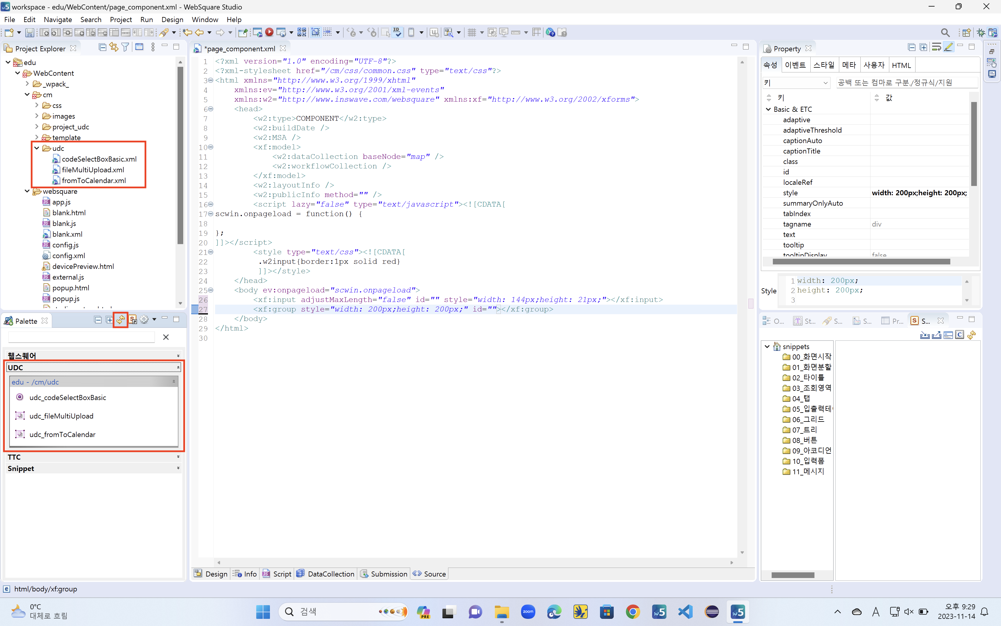 그리고 자주 사용하는 공통모듈은 Snippets에 저장해서 사용을 해도 되며, 인스웨이브 공통개발 쪽에서 udc안에 따로 모듈을 제작 후 넣어서 팔레트처럼 사용하면 된다.