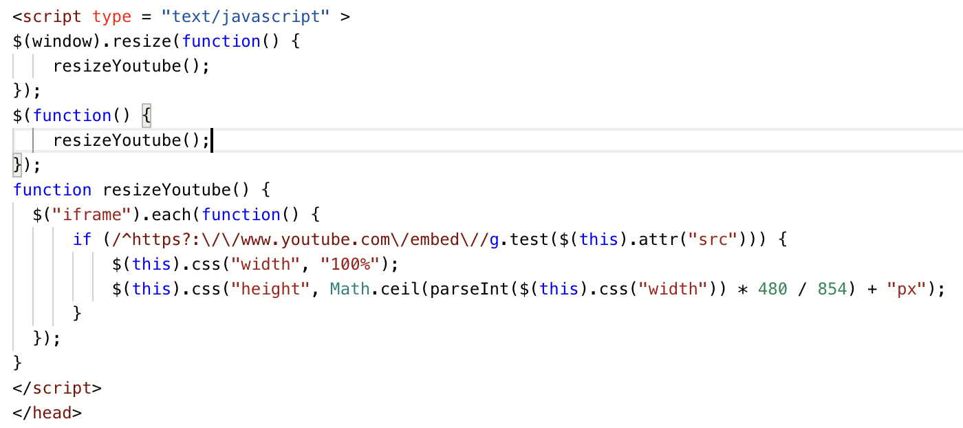이 코드는 YouTube 비디오를 포함하는 iframe을 창 크기에 맞게 조절하여 반응형 처리를 합니다.