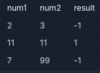 - num1이 2이고 num2가 3이므로 다릅니다. 따라서 -1을 return합니다.