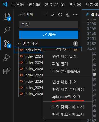 참고로 VS Code를 사용하신다면 Git 올리는 곳에서 제외할 파일 선택 후 마우스 우측 클릭 후 추가해도 됩니다.