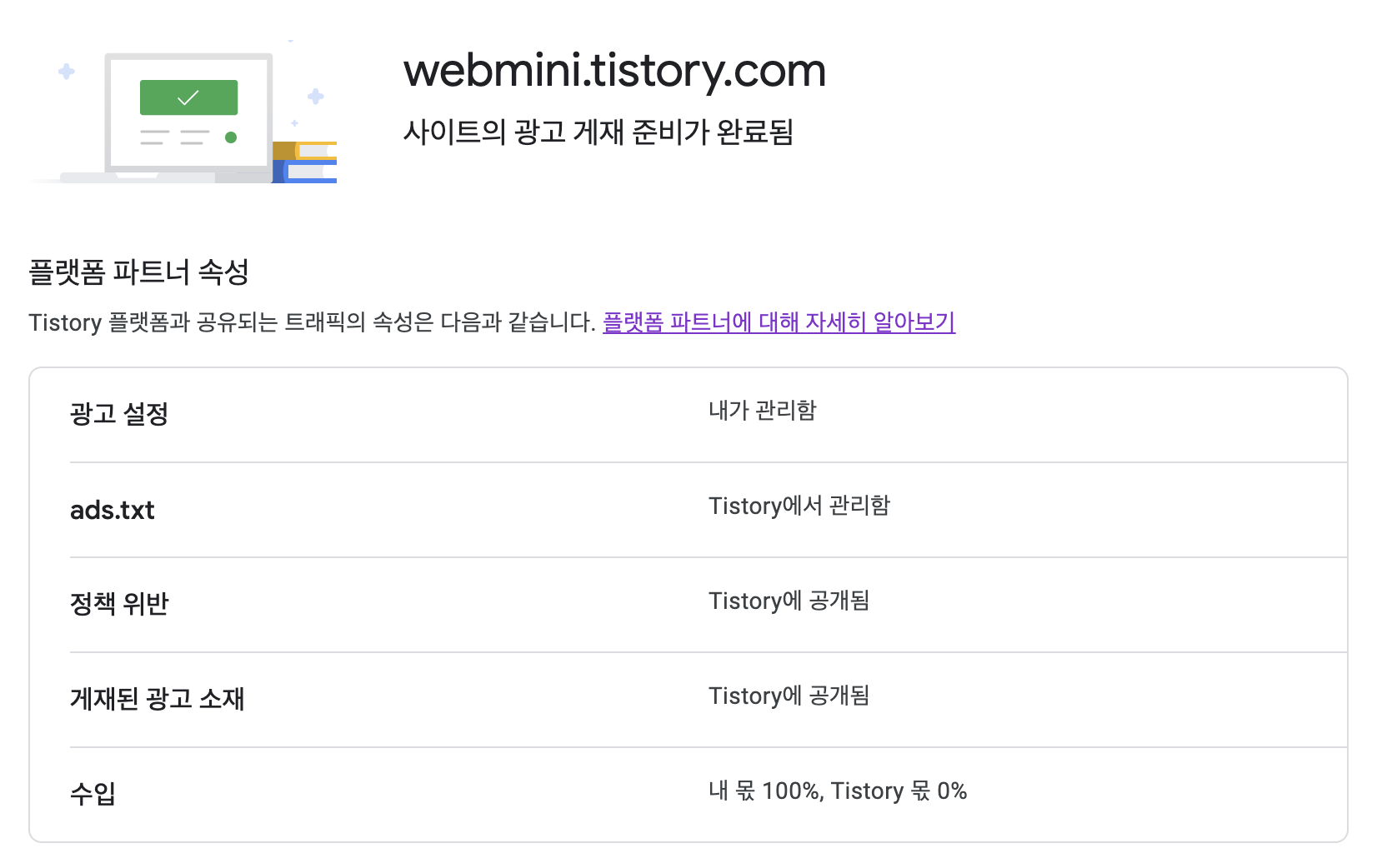 위에서 수입 쪽을 보면 "내 몫 100%, Tistory 몫 0%" 되어있다.