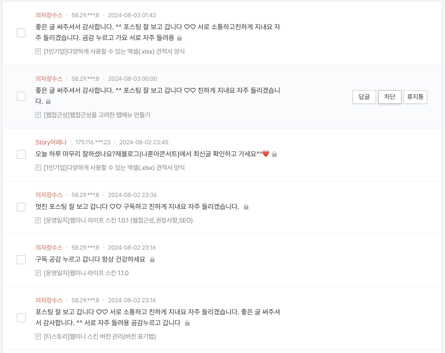 이미 등록된 스팸 댓글들은 하나씩 정리(차단)할 계획이다.