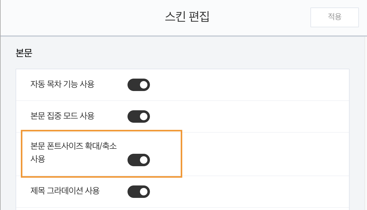 스킨편집에서 '본문 폰트사이즈 확대/축소' 기능을 설정할 수 있습니다.