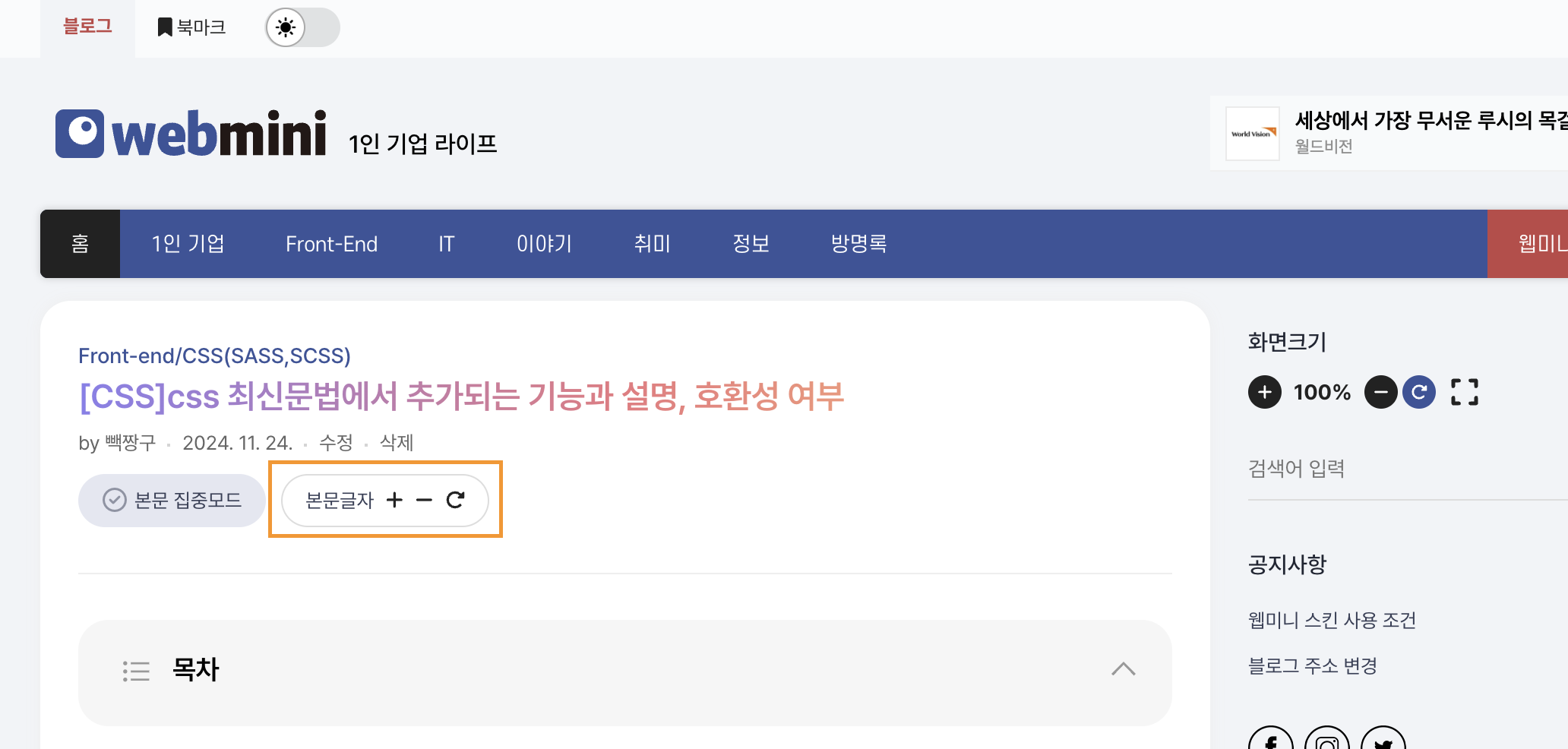 화면크기 기능과 다르게 본문글자 기능은 본문에 글자 크기만 제어합니다.