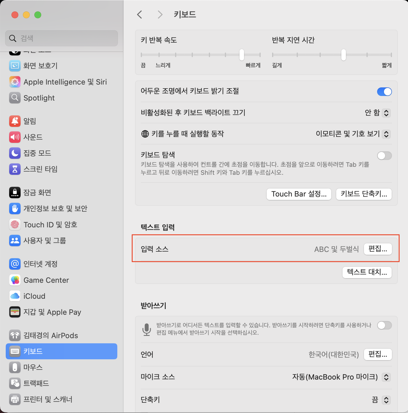 시스템 설정 > 키보드 > 텍스트 입력 (입력소스 편집)