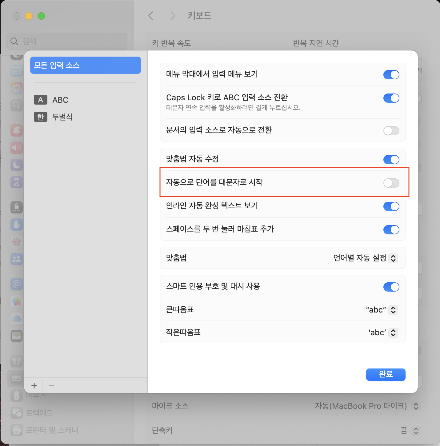 '자동으로 단어를 대문자로 시작' 체크 해제