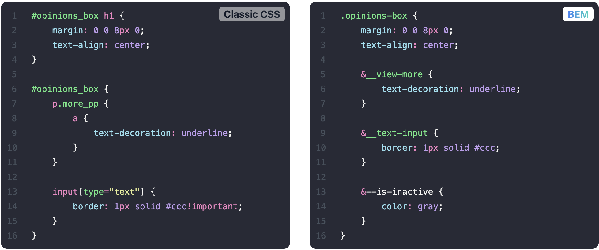 | Modifier | 상태 또는 변형 (예: btn--primary, card__title--highlighted) |