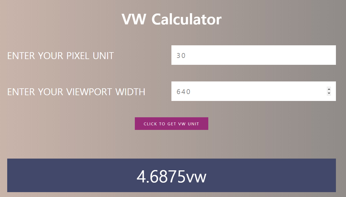 이미지 가로 사이즈가 640일 때 폰트 사이즈나 기타 margin, padding 등이 30px 이면 'ENTER YOUR PIXEL UNIT'에 30을 넣으시고 'CLICK TO GET VW UNIT'를 클릭하시면, vw로 변경된 수치를 알려줍니다.