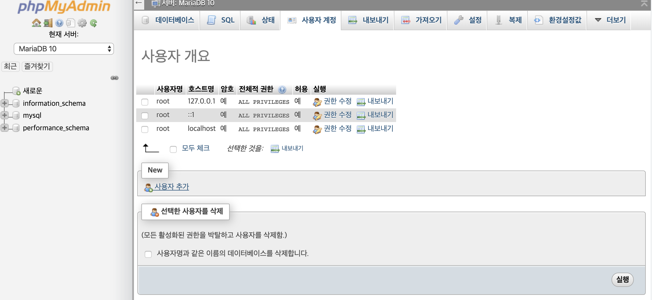 그후 생성된 데이터베이스를 클릭해서 사용자추가를 해줍니다.