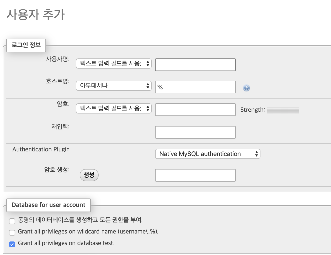 사용자 계정을 추가해서 동일 이름의 데이터베이스를 생성하는 방법도 있고, 사용자 계정을 추가후 다른이름의 데이터베이스를 생성하는 방법도 있습니다.