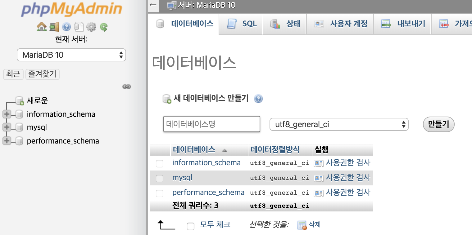 상단 데이터베이스탭 클릭후 원하시는 데이터베이스명을 입력해서 만들기를 합니다.