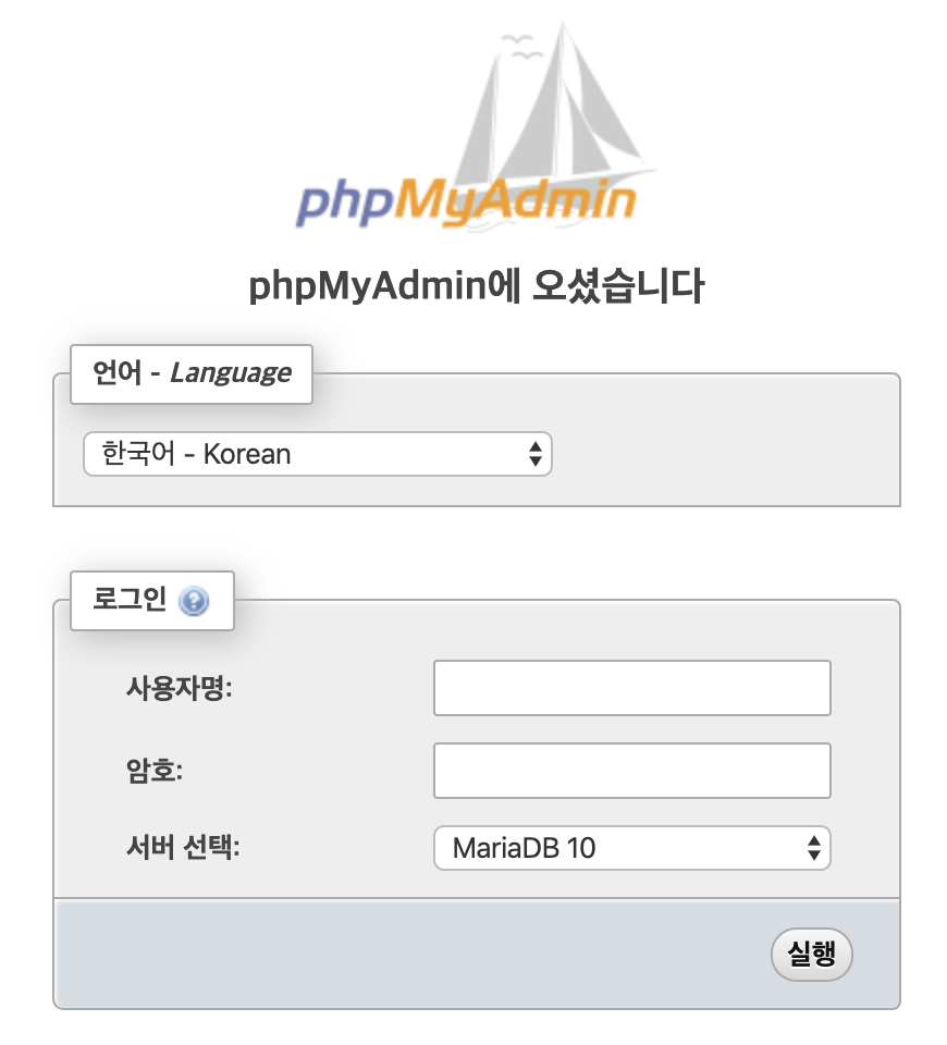 설치가 완료되었으면, 웹브라우저에서 phpMyAdmin 화면으로 이동합니다. (예. http://xxx.xxx.x.x/phpMyAdmin) 본인의 도메인 주소 또는 IP입니다.