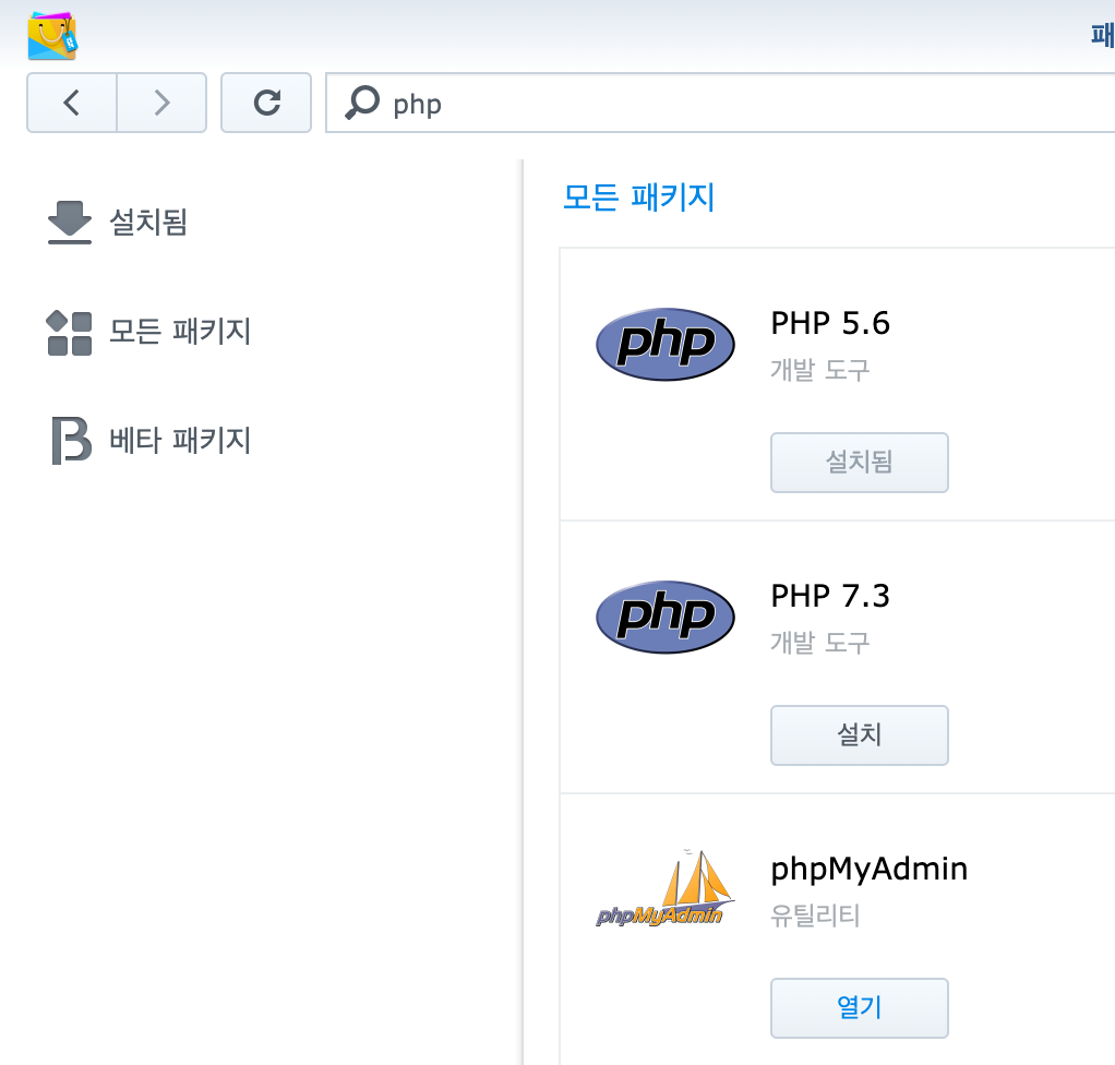 패키지 센터에서 phpMyAdmin을 설치합니다.