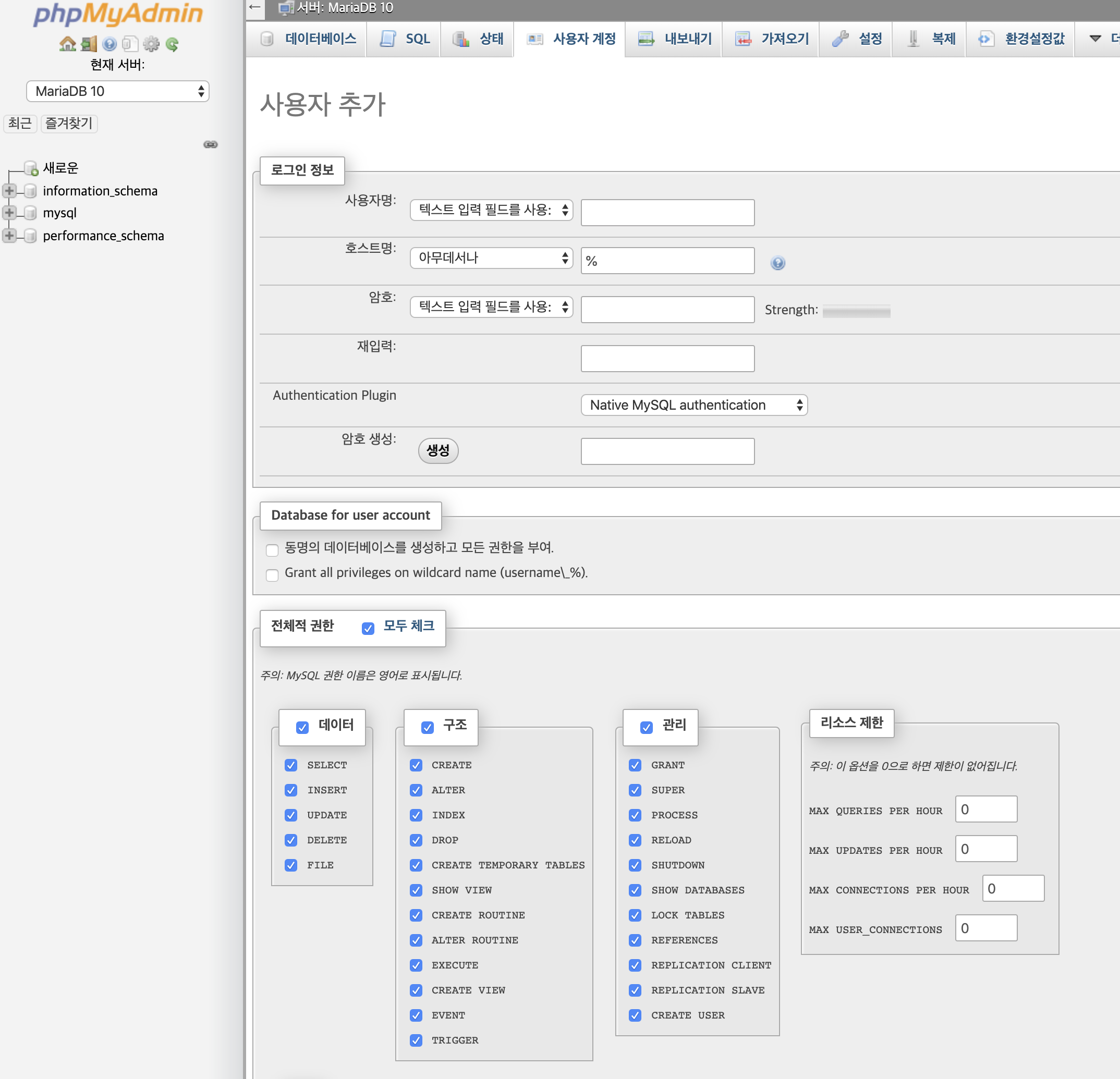 사용자 계정 추가 및 데이터베이스 생성