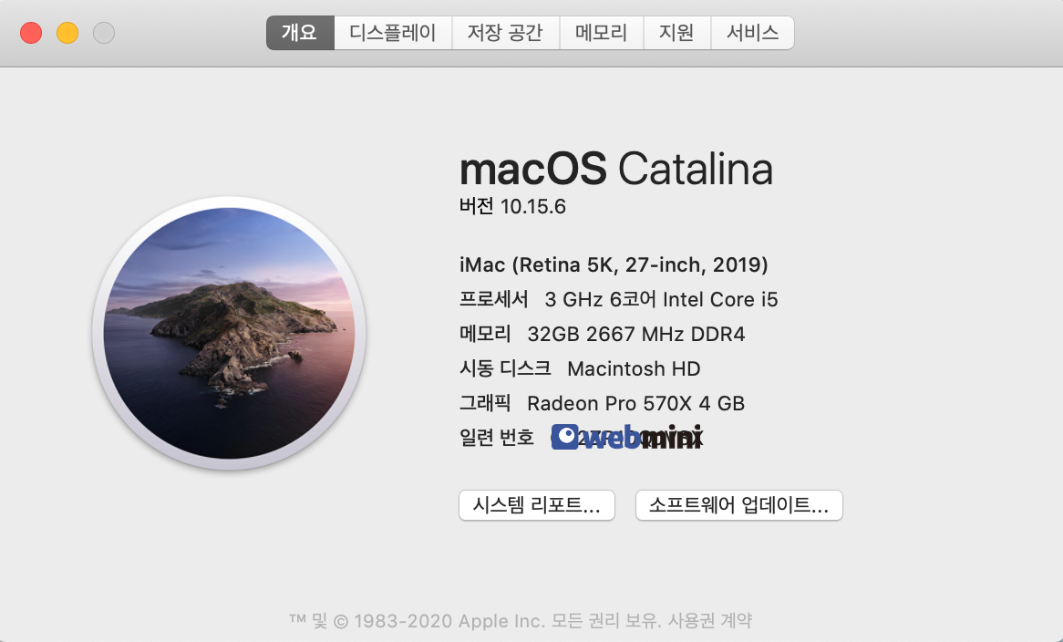 사양을 보면, macOS는 카탈리나(Catalina)를 사용중이며 메모리는 32GB 용량은 SSD 1TB 입니다.