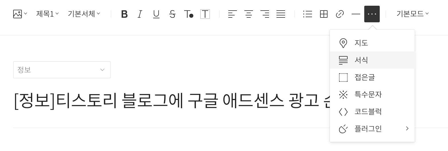 해당 방법은 티스토리 기준이며 아마도 서식이 있는 에디터에는 대부분 되리라 생각됩니다.
