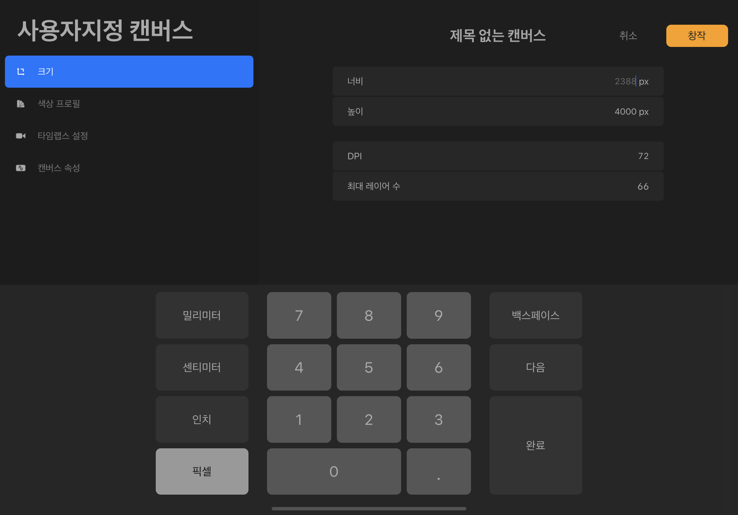 캔퍼스 크기도 추가 및 저장 할 수 있고, DPI도 설정할 수 있습니다. 그밖에 포토샵에 왠만한 기능들은 대부분 포함이 되어있습니다.