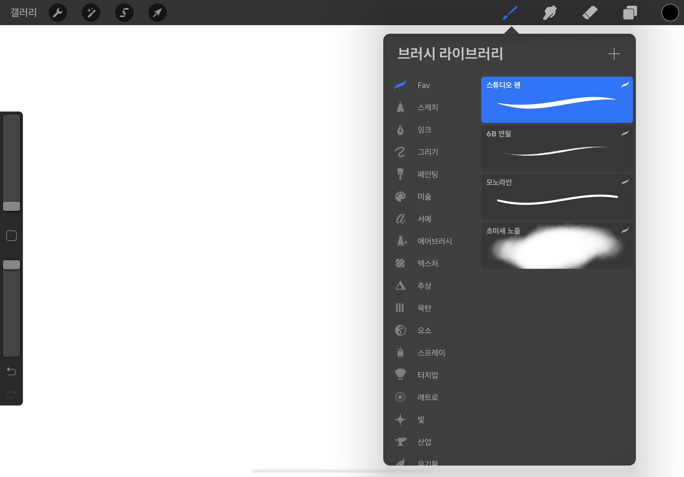 많은 브러시 라이브러리를 제공함으로서 특별한 경우가 아니면, 무료 브러시로도 왠만한 표현이 가능합니다.