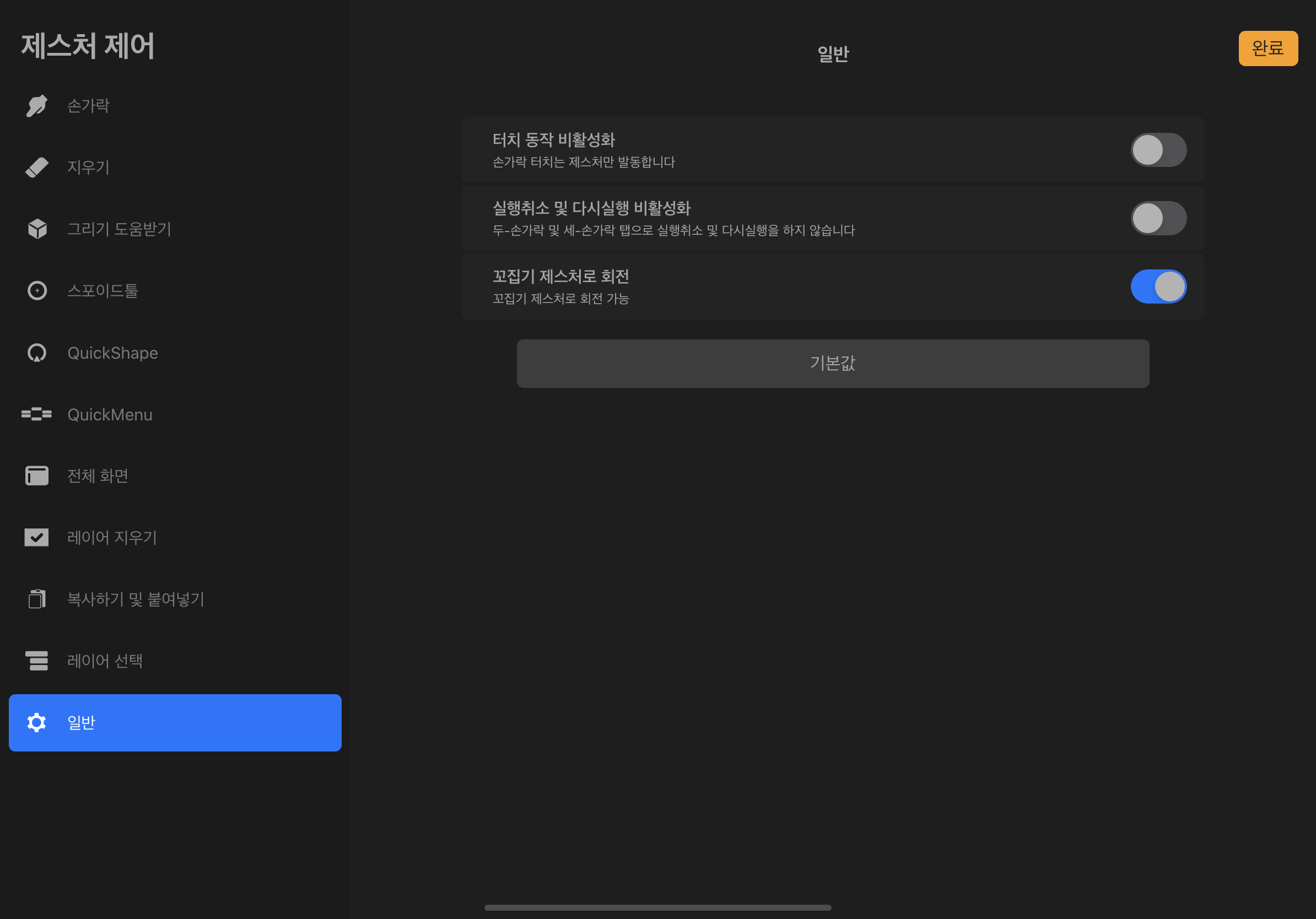 예를 들어 손가락 두개로 터치를 하면 이전단계로 돌린다던지, 손가락 하나로 꾹 누르고 있으면 스포이드 기능이 된다던지.. 제스쳐 설정으로 제어가 가능합니다. 즉 한쪽 손만 일을 하지는 않는다는 거죠^^