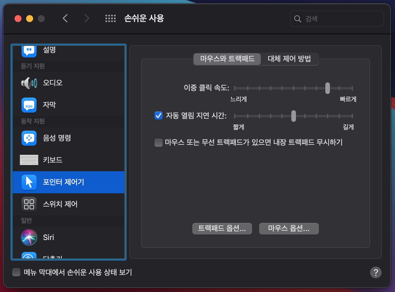손쉬운 사용에서 '포인터 제어기' > '트랙패드 옵션'을 선택합니다.