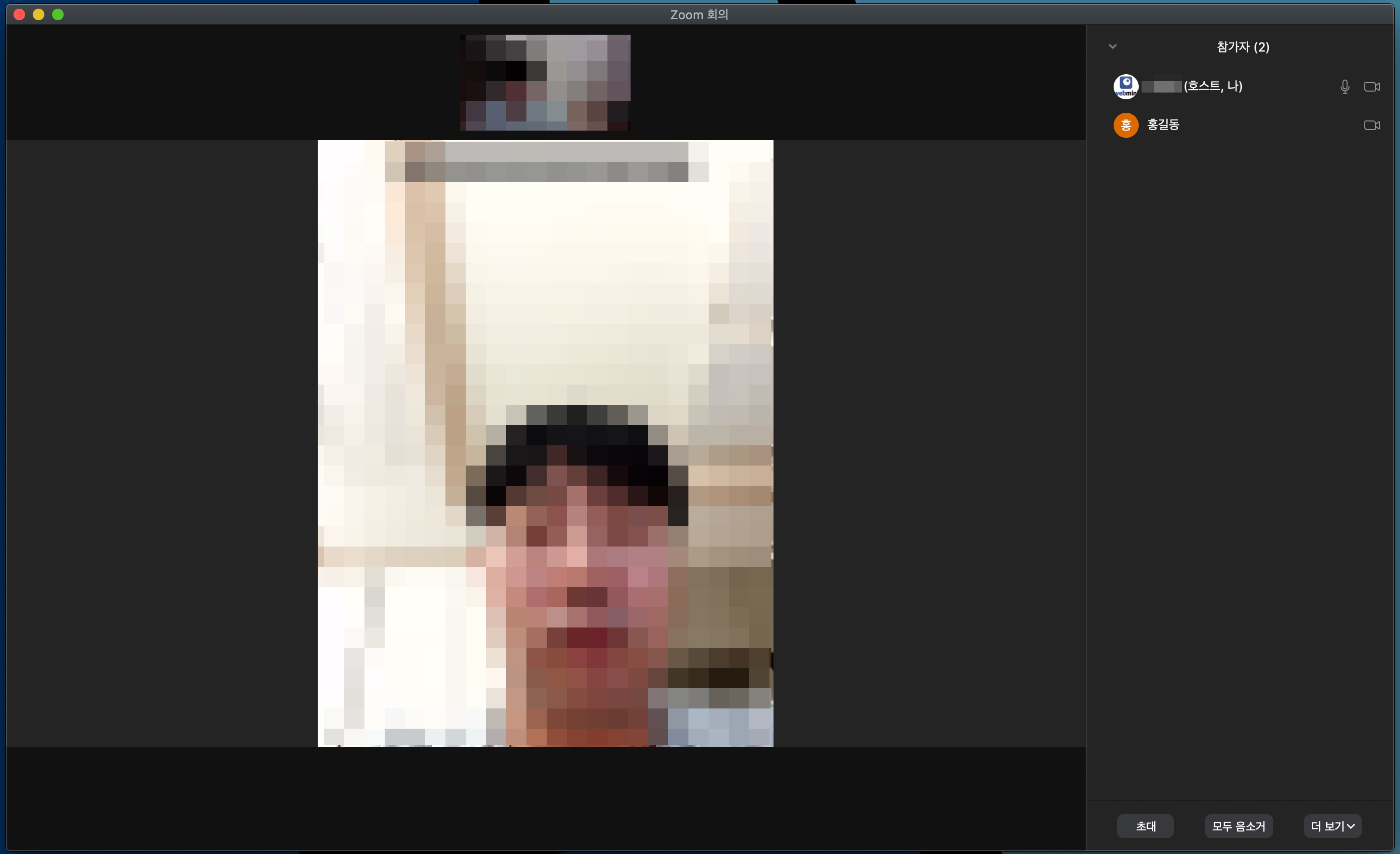 참가자 수락을 하면 위와 같이 참가자 얼굴이 보이며, 마이크와 영상이 작동을 안할시 우측에 마이크와 영상 아이콘이 보이는지 확인해 주시면 됩니다.
