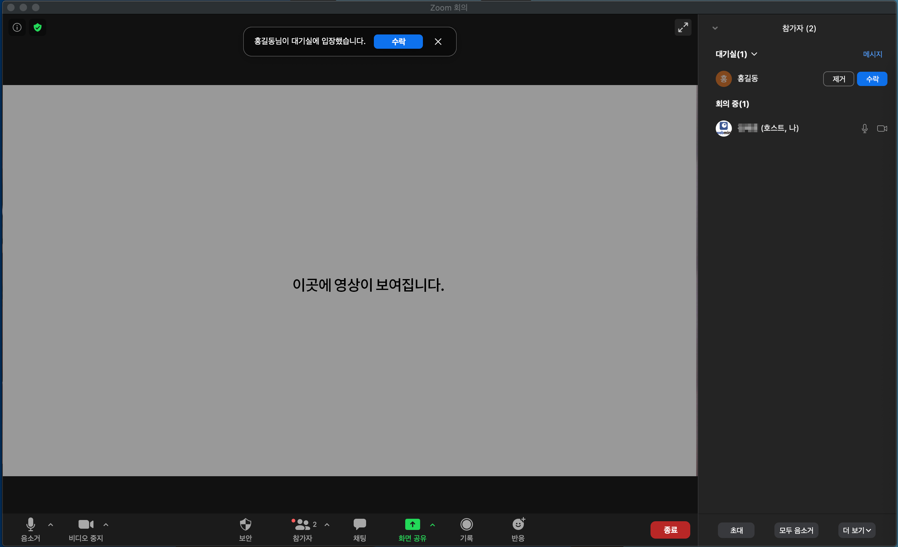 참가를 하시면 'ZOOM에 액세스 권한을 허용해 주십시오.' 라는 문구가 뜨며, 주최자에게는 참여자가 보여지게 되고 참여자 수락을 해주시면 참가자 화면에 영상이 보여지게 됩니다.